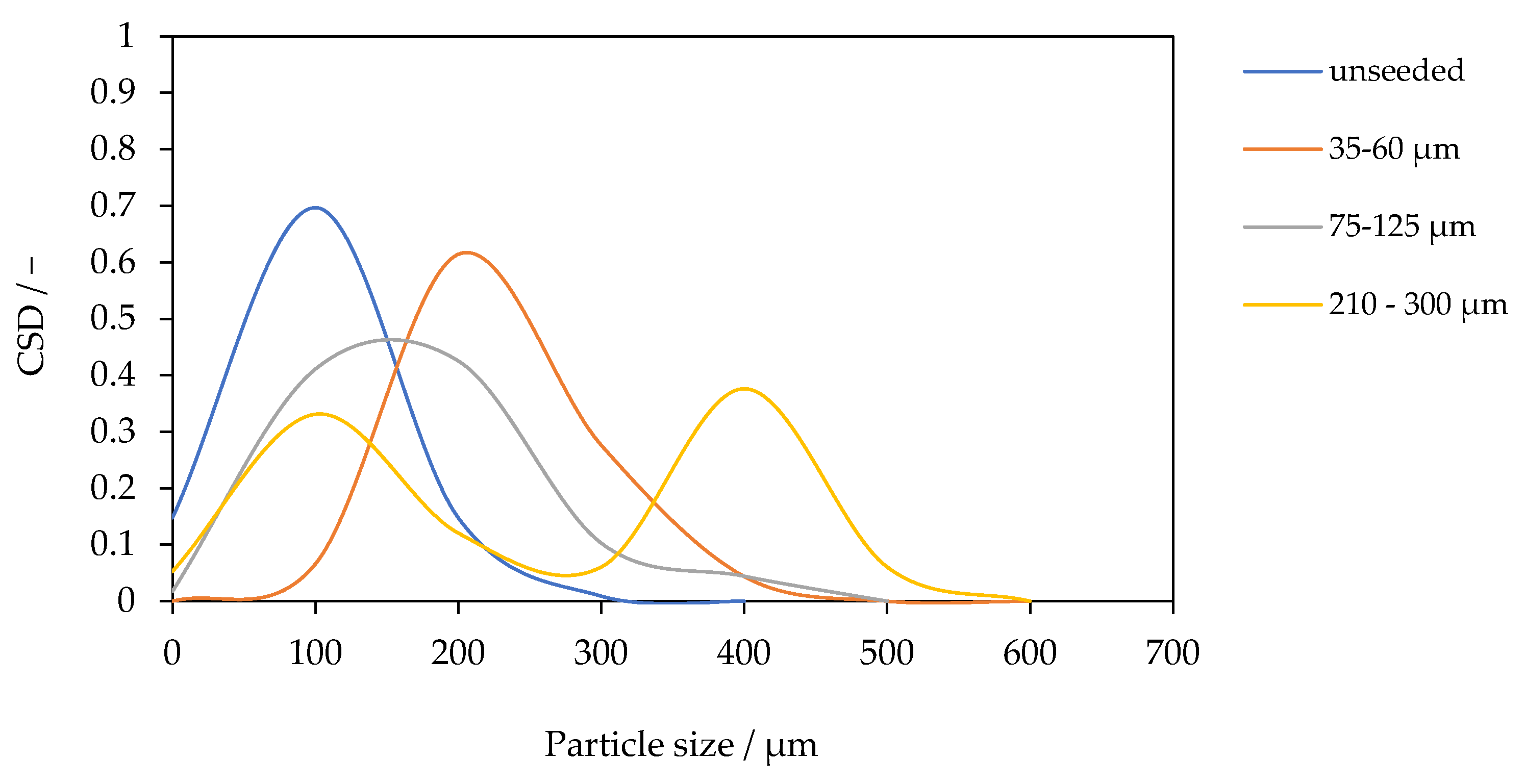 3.2. Seeding Concentration Series and Crystal Size Distribution (CSD)