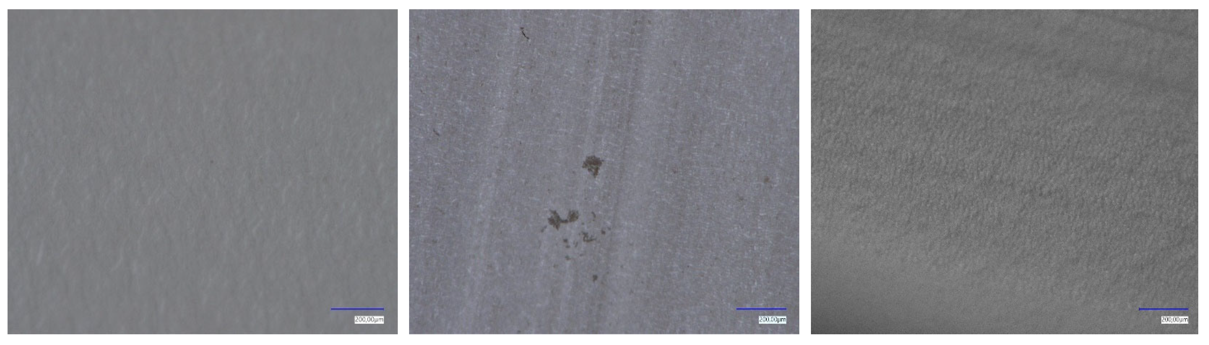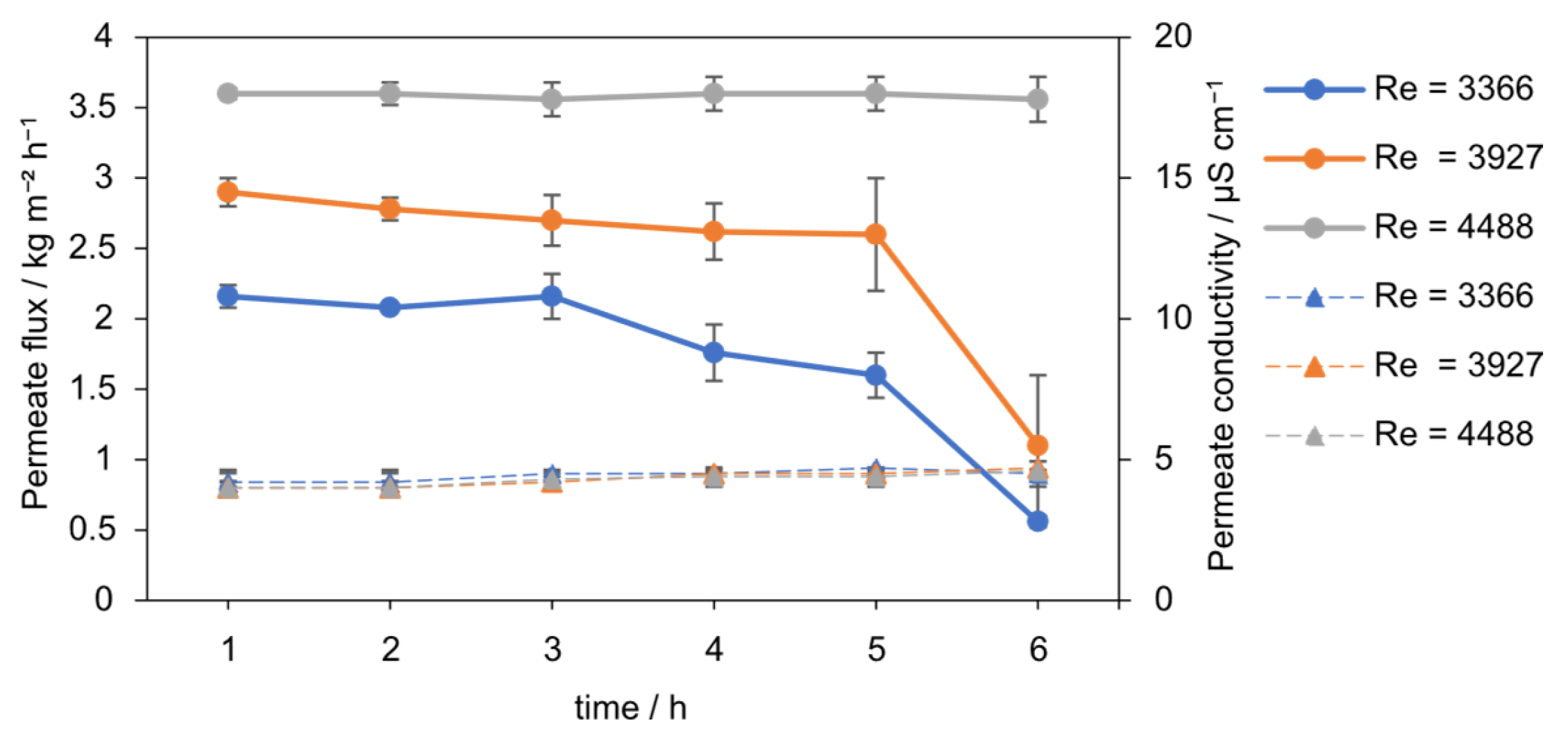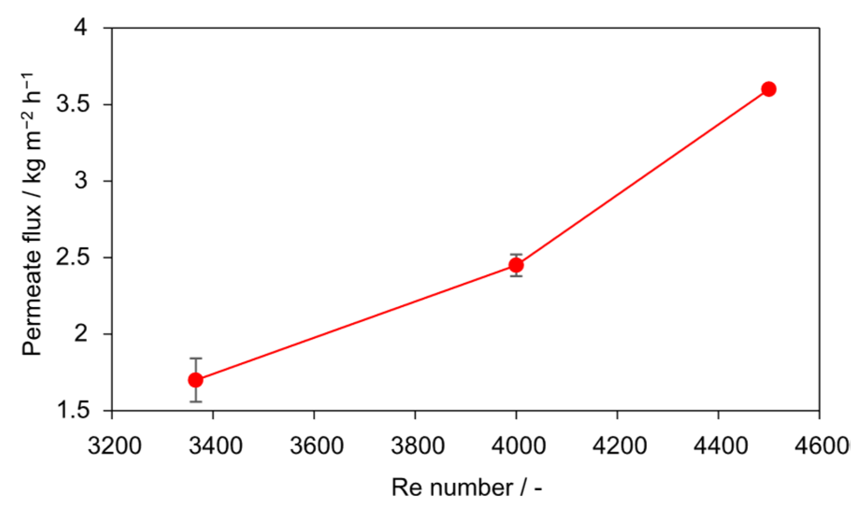 - Hydrodynamic series (PTFE only): At fixed SiO2 concentration of 0.1 g L−1 (30–60 µm), Reynolds numbers (Re) of 3366, 3927, and 4488 (transition to turbulent internal flow) were imposed by adjusting the feed flow rate , while keeping the other parameters constant. For circular-tube flow, the Re number was estimated by