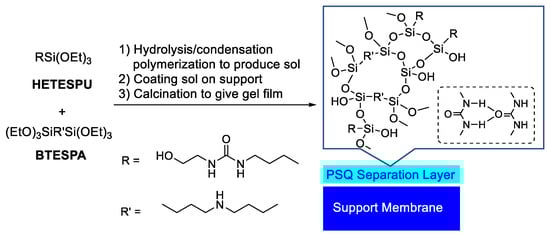 Fabrication of HETESUP-BTESPA PSQ copolymer membrane and hydrogen bonding expected for urea-urea interaction (dotted box).