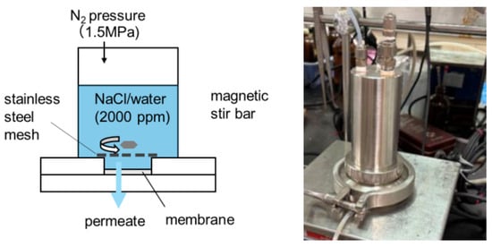 The RO performance was evaluated as described previously, utilizing the device depicted in Figure 3 [25]. The device was filled with a 2000 ppm NaCl aqueous solution, and a feed pressure of 1.5 MPa was applied to the device at 25 °C. The volume and electrical conductivity of the permeated water were measured to determine the water permeability (Lp) and NaCl rejection (R) using the following equations (Equations (2) and (3)), where Jv is water flux, ΔP and Δπ are differences in applied and osmotic pressures, and Cp and Cf are NaCl concentrations in the permeated and feed solutions, respectively.