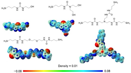 ESP maps derived from DFT calculations performed on the urea-containing monomer models at the B3LYP/6-31G level of theory using Gaussian 09. The urea and hydroxy units, as well as the ethylene glycol and amine units, play a role in enhancing the molecular polarity.