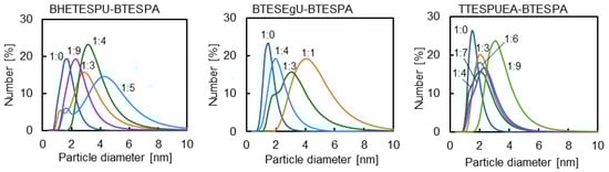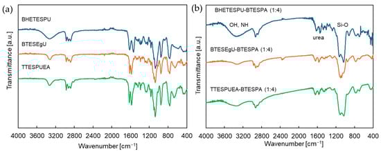 These monomers were hydrolyzed with water in ethanol to obtain sols with appropriate particle size of 1.5–10 nm as presented in Table 1 and Figure 5. The copolymerization of the urea-containing monomers with BTESPA proceeded more rapidly than homopolymerization, which was attributed to the amine site of BTESPA catalyzing the polymerization. The sol was then coated onto an organic support membrane and calcined at 150 °C in air to promote gelation. The IR spectra of the gel film prepared by coating a KBr plate with the sol and calcination at the same temperature are shown in Figure 6. The spectra showed broad bands around 3300 cm−1, corresponding to the stretching frequencies of the O-H and N-H bonds. The broad Si-O stretching bands at approximately 1000 cm−1 were intensified compared to those of the monomers. For BHETESPU-BTESPA and TTESPUEA-BTESPA, the stretching bands of the C-O bonds likely overlapped with those of the Si-O bonds. The BHETESPU-BTESPA containing C-OH units showed a more pronounced O-H/N-H band than the others. The spectra also revealed two sharp bands at 1620–1650 and 1540–1570 cm−1. These bands are characteristic of urea units bearing interunit hydrogen bonding [33], indicating that the urea units did not decompose during calcination (Figure 6). Although the thermal decomposition of urea has been reported to begin at 152 °C [34], it was previously reported that monosubstituted urea units in PSQ decompose at higher temperatures [35].