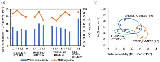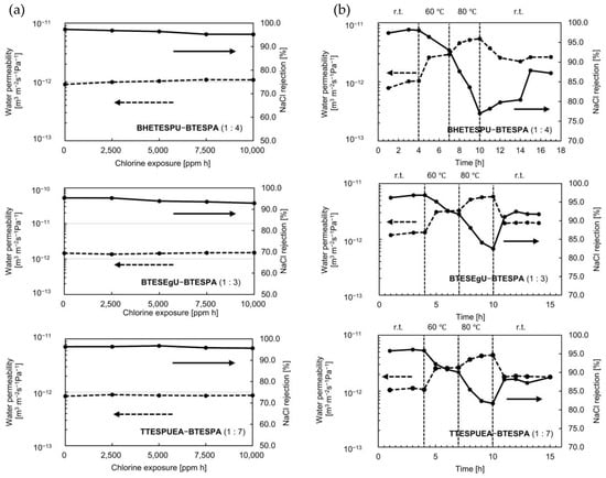 The chlorine resistance of the membranes was examined by immersing them in a 1000 ppm NaOCl aqueous solution at room temperature. As shown in Figure 9a, the membranes exhibited high chlorine resistance, as expected. They showed only 1–3% decreases in NaCl rejection, even after 10,000 ppm h exposure to chlorine, together with 3–19% increases in water permeability. This contrasted with the HETESPU-BTESPA membranes, which underwent evident deterioration under the same conditions, reducing the NaCl rejection by approximately 20% from the original data prior to exposure to chlorine [24]. This is likely due to the reduced number of NH bonds in BHETESPU and the bridged structures in BTESEgU and TTESPUEA. Bridged structures can prevent the disassembly of network PSQ structures, even if the urea units are partially decomposed. The heat resistance of the membranes was examined by conducting RO experiments at high temperatures. Increasing the operational temperatures resulted in enhanced water permeability and a reduction in NaCl rejection, likely due to the thermally enhanced vibration of the PSQ network. Upon conducting the RO experiments at 60 °C and subsequently cooling to room temperature, the original data were recovered. However, once the operation temperature was raised to 80 °C, the original data could not be recovered by cooling the temperature to room temperature. The water permeability increased and the NaCl rejection decreased by changing the temperatures, as shown in Figure 9b. This indicates that the membrane partially deteriorated at 80 °C, similar to the HETESPU-BTESPA membranes [24]. Among them, the BTESEgU-BTESPA (1:3) membrane exhibited the highest heat resistance, exhibiting only a 4.5% decrease in NaCl rejection. This is similar to the HETESPU-BTESPA (1:3) membrane, which showed a 4.9% decrease in NaCl rejection under the same conditions (from 96.1% to 91.2%) [24].