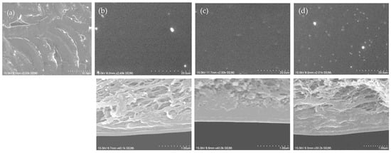 Surface (top) and cross-section (bottom) SEM images of (a) BTESEgU homopolymer membrane, and (b) BHETESPU-BTESPA (1:4), (c) BTESEgU-BTESPA (1:3), and (d) TTESPUEA-BTESPA (1:7) copolymer membranes. The bright spots on the surface appear to be due to contaminants, such as dust. In the cross-section images, the lower part corresponds to the PSQ layer.