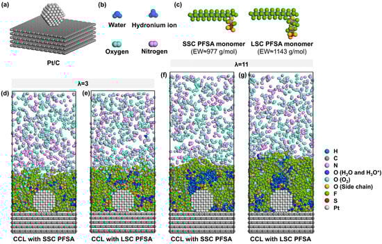 Schematic illustration of model components, (a) Pt/C, (b) water, hydronium ion, oxygen and nitrogen, (c) monomer of SSC and LSC PFSA chains with EW ≈ 977 and 1143 g/mol, (d,e) cross-sectional view of CCLs with SSC and LSC PFSA under λ = 3, (f,g) cross-sectional view of CCLs with SSC and LSC PFSA under λ = 11 (the wall at the top is hidden for simplicity).