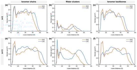 Density distribution along z-axis: (a,d) ionomer chains, (b,e) water clusters, and (c,f) ionomer backbones. (a–c) for λ = 3, (d–f) for λ = 11, respectively.