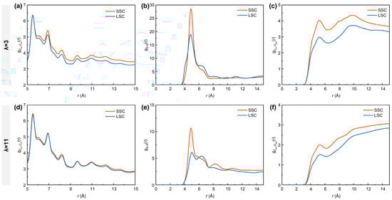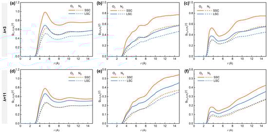 RDFs of (a,d) Cm-O2/N2, (b,e) S-O2/N2, (c,f) Owh-O2/N2. (a–c) for λ = 3, (d–f) for λ = 11, respectively.