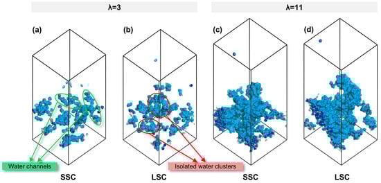 Water morphology in CLs of SSC and LSC PFSA, (a,b) λ = 3, (c,d) λ = 11.