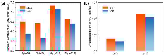 To quantitively analyze the transport, we computed the diffusion coefficients of O2, N2 and H3O+ in SSC and LSC ionomers under hydration conditions of 3 and 11. As presented in Figure 6a,b, both O2 and N2, as well as H3O+, exhibit higher diffusion coefficients under elevated hydration conditions, consistent with previous reports [38,58]. Due to the smaller kinetic diameter of O2 (O2 ~3.43 Å, N2 ~3.67 Å [59]) which indicates greater accessible free volume, it shows generally larger diffusion coefficients than N2. Importantly, the diffusion coefficients of O2 and N2 are systematically higher in SSC ionomers compared with LSC ionomers, which can be attributed to the continuous hydrophilic and hydrophobic interfacial regions which enhance gas transport. In addition, the differences between diffusion coefficients of gases in SSC and LSC systems are reduced at high hydration, indicating that swelling may lead to a relatively more homogenized gas transport pathway influenced by water as mentioned before. Nevertheless, SSC ionomers retain higher diffusion coefficients for H3O+ compared to LSC ionomers due to the persistent presence of continuous water channels.