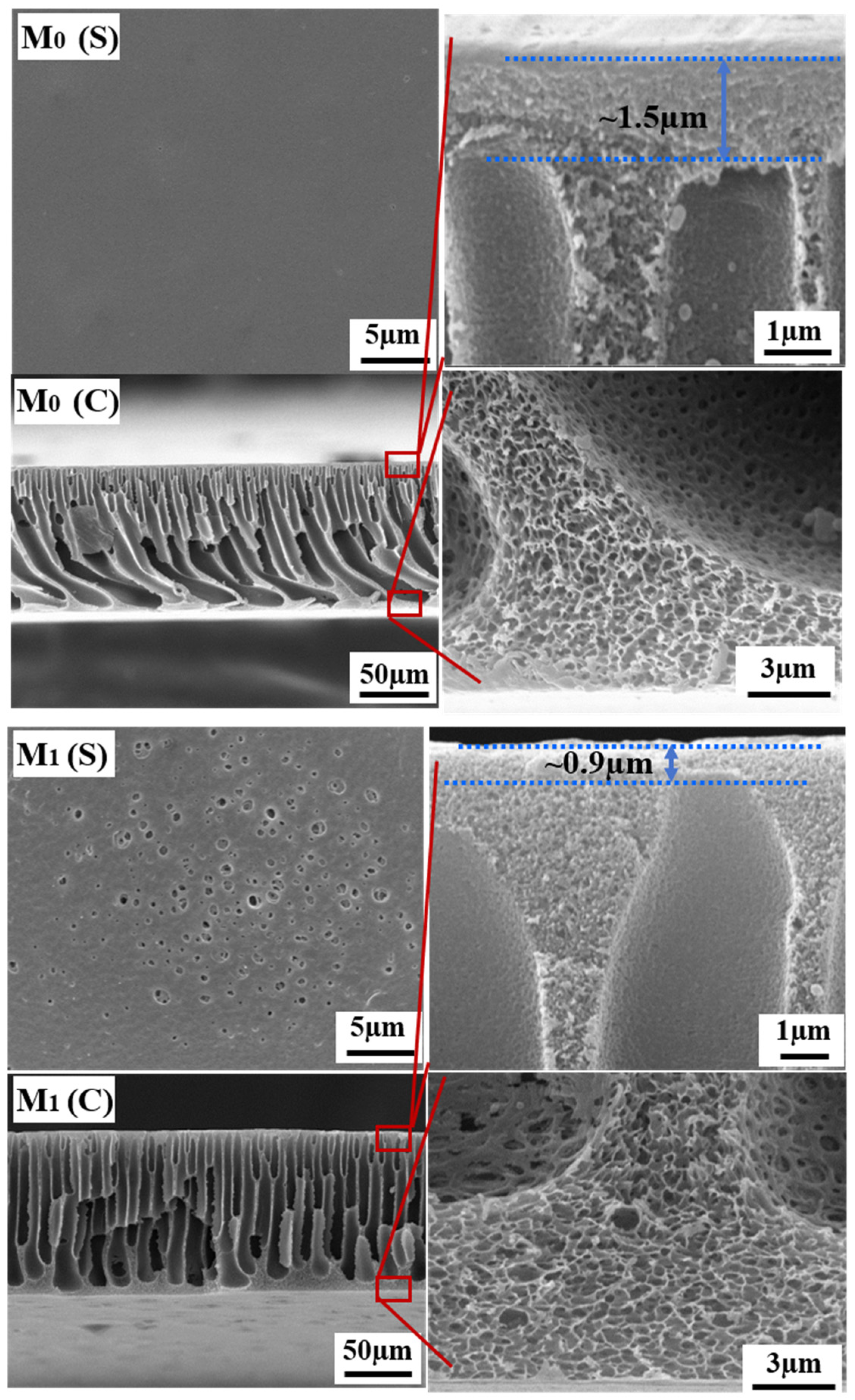 Figure 1. Surface and cross-sectional SEM images of the M0 and M1 UF membranes.