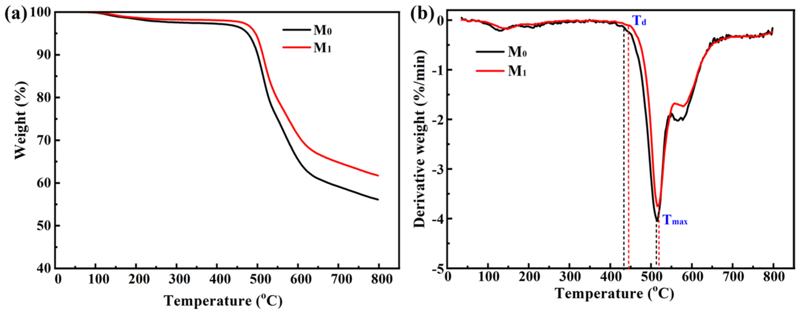 The TG and DTG curves of M0 and M1 membranes (Figure 3) reveal that the thermal decomposition temperatures—including the initial decomposition temperature (Td) and the temperature at maximum decomposition rate (Tmax)—of the M1 membrane are slightly higher than those of the pristine M0 membrane, indicating enhanced thermal stability. This improvement may be attributed to the in situ formed TiO2 cross-linked network via the sol–gel method, which strengthens the intermolecular interactions within the polymer matrix. Additionally, the hydroxyl groups on the surface of TiO2 nanoparticles can form hydrogen bonds with functional groups in the polymer chains, further enhancing intermolecular forces and thermal stability. This effect helps mitigate polymer chain melting during the thermal crosslinking treatment process, thereby contributing to the preservation of the membrane’s porous structure.