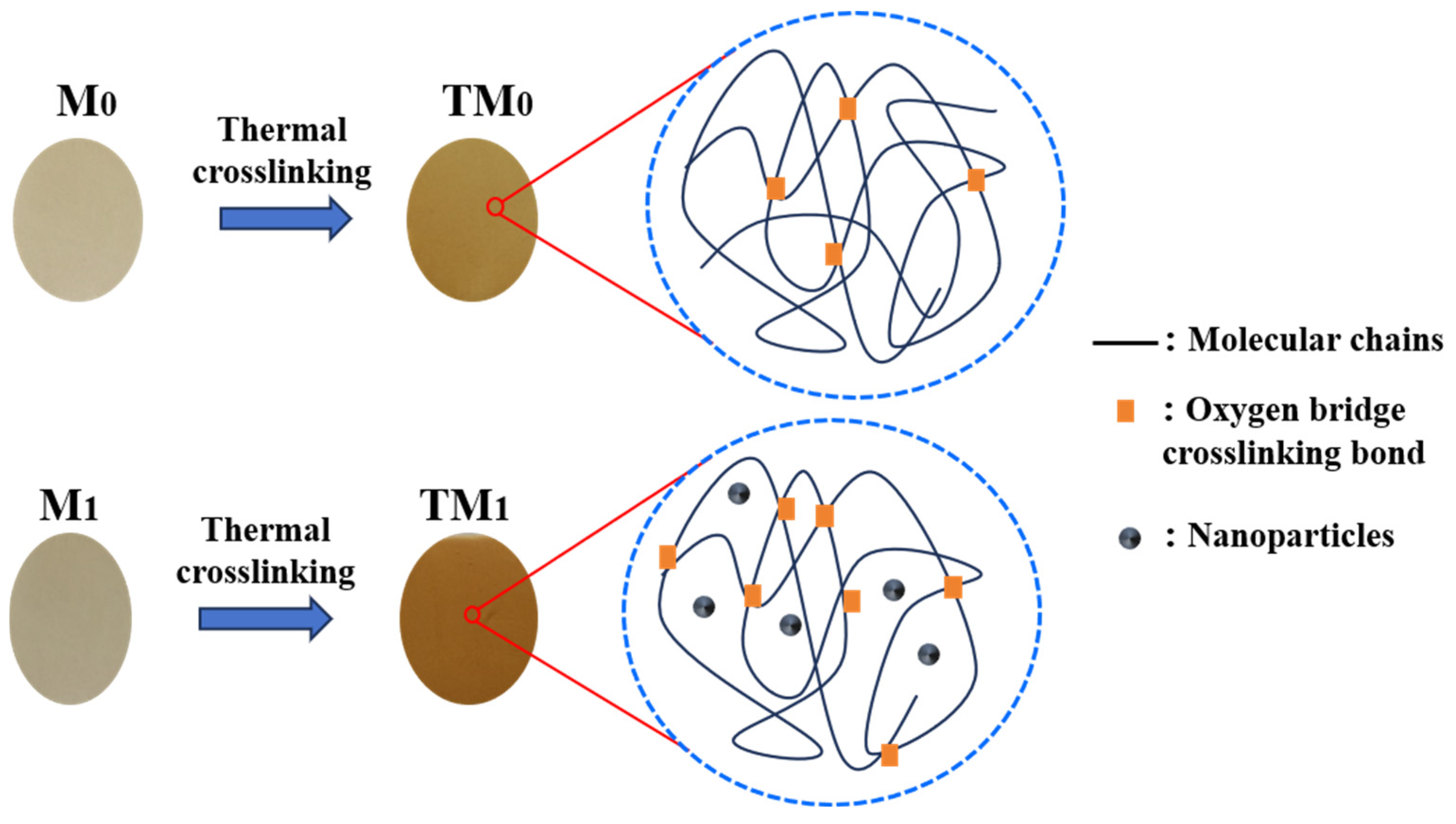 Figure 4. Color changes in the M0 and M1 membranes after thermal crosslinking treatment and schematic diagram of thermal crosslinking molecular structure.