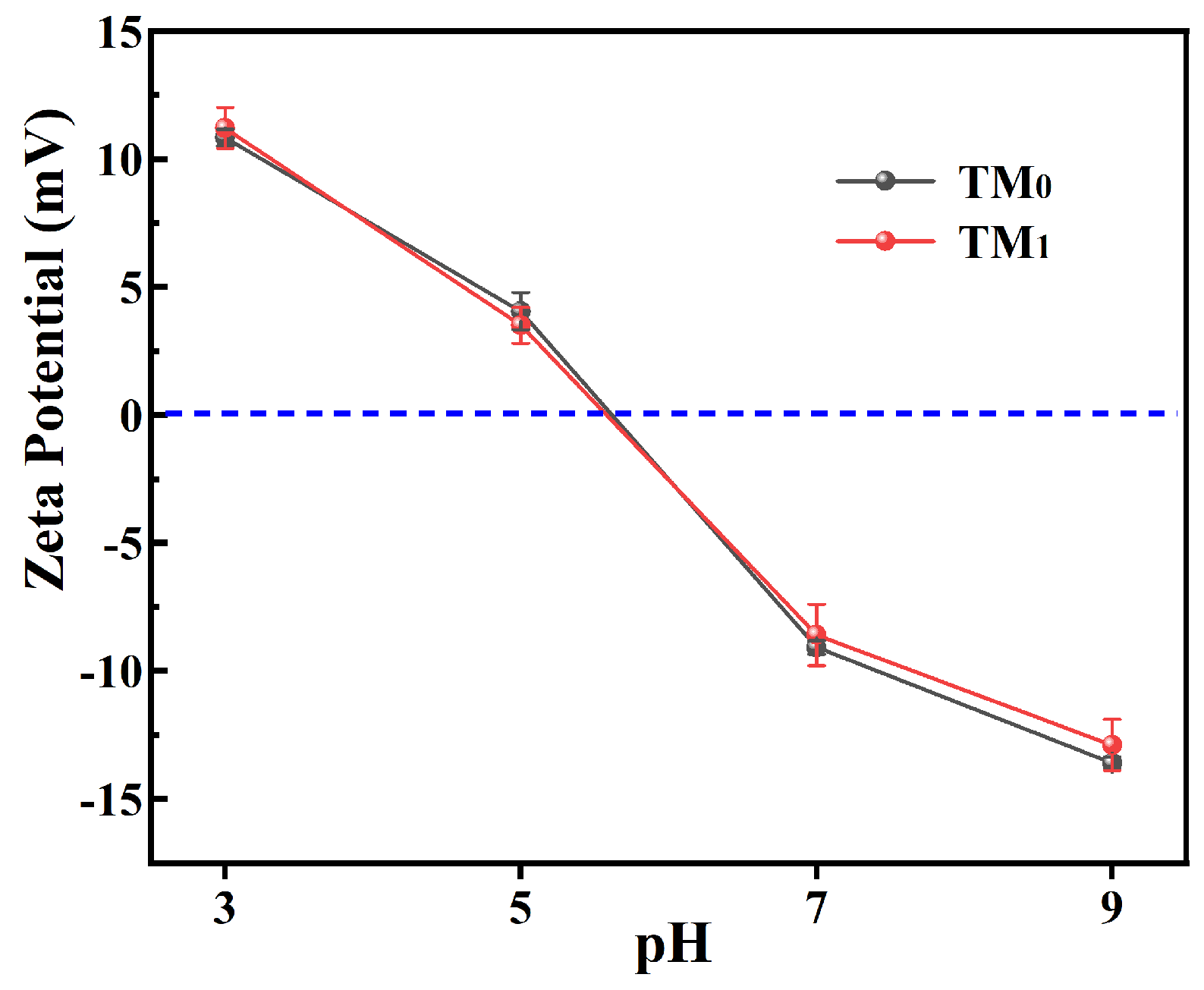 Figure 6 shows the water contact angles at 0 s of the membranes. All obtained membranes exhibited contact angles of less than 90°, indicating good hydrophilicity. Compared to the M0 membrane, the M1 membrane showed a lower contact angle, which is primarily attributed to the incorporation of hydrophilic TiO2 nanoparticles. After thermal cross-linking, the surface pores contracted, leading to densification of the skin layer and a slight increase in the water contact angle. Nevertheless, the contact angle of TM1 remained lower than that of TM0, which also contributes to enhancing the permeation flux of the membrane. The zeta potential of the TM0 and TM1 thermal crosslinking membranes under different pH conditions indicates that the membrane surfaces are positively charged at pH below 5.5 and negatively charged at pH above 5.5 (Figure 7). This charge characteristic facilitates the rejection of negatively charged components or anions in tobacco extract through Donnan exclusion effects [14]. Given that nicotine is predominantly uncharged under the experimental conditions of tobacco extract processing, the Donnan exclusion effect might have played a limited role in the current study. In subsequent industrial applications, adjusting the tobacco extract to acidic conditions (e.g., pH < 5) may further enhance nicotine rejection by promoting its protonation and leveraging charge-based repulsion mechanisms.