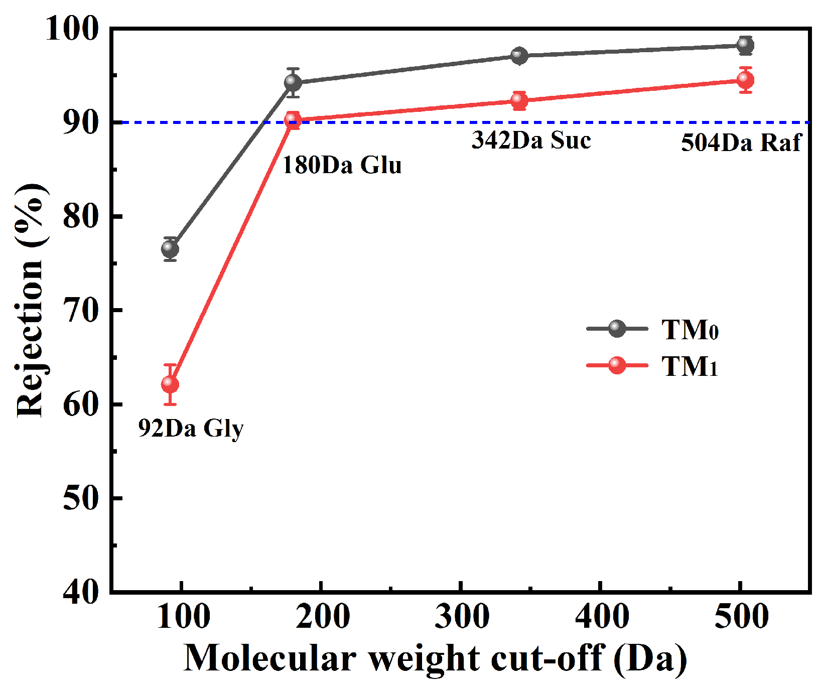 To evaluate the molecular weight cut-off (MWCO) of the TM0 and TM1 thermal crosslinking membranes, four neutral organic solutes with different molecular weights were selected as probe molecules: raffinose (Raf, 504 Da), sucrose (Suc, 342 Da), glucose (Glu, 180 Da), and glycerol (Gly, 92 Da). The rejection rates of these molecules by the membranes were measured accordingly. As shown in Figure 8, the rejection rate increases with the molecular weight of the probe molecules, demonstrating a clear molecular sieving effect. Specifically, for each probe molecule, the TM0 membrane exhibited higher rejection rates than the TM1 membrane, which is closely related to their pore structures and indirectly confirms that the average pore size of TM1 is slightly larger than that of TM0. Furthermore, both TM0 and TM1 membranes showed rejection rates exceeding 90% for glucose. According to the standard definition of MWCO [33], their MWCO can be determined as 180 Da. This value matches the molecular weight of nicotine (162 Da) in tobacco extract, indicating that the membranes are suitable for the extraction and concentration of nicotine from tobacco extracts.