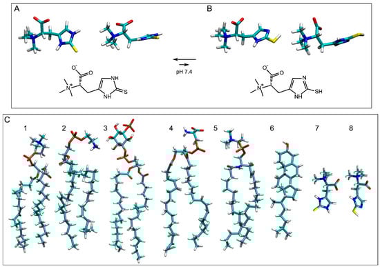 Oxidative stress leads to neurodegeneration and ageing, both of which pose a major challenge to human health [30]. Antioxidants aim to stop the loop between oxidative stress, inflammation, protein misfolding, and lipid peroxidation that together cause a number of diseases [31]. Ergothioneine is a molecule derived from histidine (2-mercaptohistidine trimethylbetaine) and presents two tautomeric forms: thione, the major and more stable form (ERGO), and thiol (ERGT) (Figure 1A and Figure 1B, respectively) [32]. This occurs because under physiological conditions, the thiocarbonyl group of ERGO is more stable than the sulfhydryl group of ERGT [28,32,33,34]. Moreover, ERGO has a greater resistance to autooxidation than ERGT, and additionally, ERGO has greater thermal and chemical stability than other biological thiols such as glutathione [32,34,35]. ERGO and ERGT, being low-molecular-mass molecules and containing polar groups, are highly soluble in water [32]. Ergothioneine is noticeably different from glutathione due to its lower redox potential, tautomerization, and potent antioxidant properties [9]. Significantly, ergothioneine can easily chelate divalent metal ions to form inactive ergothioneine–metal complexes and is a potent scavenger of reactive oxygen and nitrogen species, which are known to damage lipids, proteins, and nucleic acids, altering their functions [11,36].
