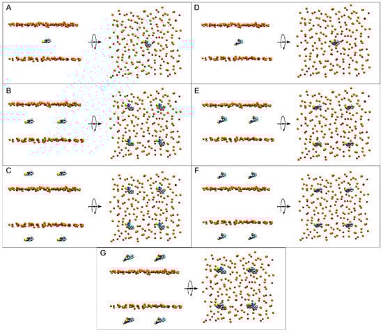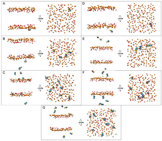 The multicomponent membrane systems were obtained using Charmm-Gui (http://www.charmm-gui.org, accessed on 19 May 2025 [60]). Systems contained NaCl at physiological conditions, i.e., a concentration of 150 mM and an excess of water [61] in a neutral environment (Table 1) [62,63,64]. Membranes were like the plasma membrane (Table 1) and contained 56 molecules of 1-palmitoyl-2-oleoyl-sn-glycero-3-phosphocholine (POPC), 34 molecules of 1-palmitoyl-2-oleoyl-sn-glycero-3-phosphoethanolamine (POPE), 14 molecules of 1-palmitoyl-2-oleoyl-sn-glycero-3-phosphoserine (POPS), 12 molecules of 1-palmitoyl-2-oleoyl-sn-glycero-3-phosphoinositol-3-phosphorous (PI-3P), 24 molecules of N-stearoyl-D-erythro-sphingosylphosphorylcholine (PSM), and 60 molecules of cholesterol (CHOL) (Table 1) [65,66]. For ERGO, three systems were studied: a membrane system containing one ERGO molecule, system 1 (Figure 2A); a membrane system containing four ERGO molecules, system 2 (Figure 2B); and a membrane system containing eight ERGO molecules, system 3 (Figure 2C). Similarly, for ERGT, three systems were studied: a membrane system containing one ERGT molecule, system 4 (Figure 2D); a membrane system containing four ERGT molecules, system 5 (Figure 2E); and a membrane system containing eight ERGT molecules, system 6 (Figure 2F). In addition, system 7 contained a membrane plus four ERGO and four ERGT molecules (Figure 2G). The lipid chemical structures are shown in Figure 1C. Membrane fluidity was augmented using one oleoyl hydrocarbon chain in the phospholipids [53,54]. PSM, apart from the sphingosyl chain, contained a palmitoyl one. The molecular structure of ERGO was obtained from PubChem (https://pubchem.ncbi.nlm.nih.gov/compound/5351619, accessed on 29 April 2025) and was revised and minimized using Discovery Studio 4.0 (Accelrys Inc., San Diego, CA, USA). ERGT was obtained, revised, and minimized from ERGO, also using Discovery Studio 4.0 (Accelrys Inc., San Diego, USA). The CHARMM General Force Field stream files of both ERGO and ERGT were attained with Charmm-Gui (http://www.charmm-gui.org, accessed on 19 May 2025 [60]).