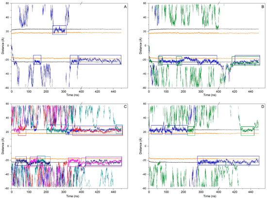 Time variation in the whole-molecule ERGO z-axis COM distance in relation to (A) system 1, (B) system 2, (C) system 3, and (D) system 7. Only ERGO molecules bound to the membrane for the last 30 ns of MD are shown. Each ERGO molecule is represented by a different colour. Coloured boxes mark the ERGO molecules that are bound to the membrane interphase along the whole MD. The phosphate atoms of the phospholipids and the oxygen atom of cholesterol are shown in black and orange colours, respectively.
