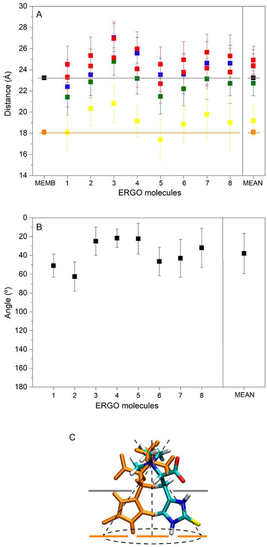 Summarizing the results obtained for all the systems studied here, ERGO molecules spontaneously insert into the membrane interphase; they can move from it to the water phase and vice versa, and they do not show oligomerization. However, and in contrast to ERGO, ERGT molecules do not insert into the membrane interphase at any time. The average z-COM distances for the ERGO molecules in the membrane interphase and for the last 30 ns of MD simulation were 24.3 ± 1.5 Å for the trimethylammonium nitrogen, 24.9 ± 1.3 Å and 24.4 ± 1.1 Å for the oxygen atoms, and 19.2 ± 1.4 Å for the sulphur atom (Figure 5A). The average location of the sulphur atoms lies slightly above the oxygen atoms of CHOL, whereas the trimethylammonium nitrogen and oxygen atoms are located slightly above the phosphate atom level.