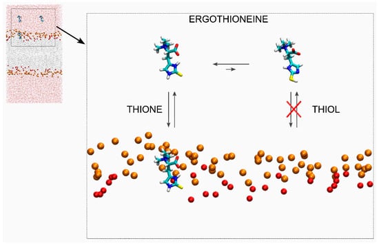 It is known that, in general, lipophilic antioxidants, such as vitamin E, astaxanthin, or coenzyme Q, protect lipid peroxidation, whereas hydrophilic antioxidants, such as vitamin C or glutathione, protect proteins [27,28,49,50]. Recent data suggest that ergothioneine is coupled with the glutathione and vitamin C redox cycles [13]. ERGO is hydrophilic (Figure 1A) and has a consensus octanol–water partition coefficient log P value of −1.56 (http://www.swissadme.ch/, accessed on 18 August 2025). ERGT is also hydrophilic (Figure 1B) and has a slightly higher consensus log P value, −1.60 (i.e., it is a bit more hydrophilic than ERGO). Due to its hydrophilicity, ergothioneine has been proposed to act at the water level but not at the membrane level. In this work, I studied the possible interaction of both ERGO and ERGT with a complex biomembrane by molecular dynamics (MD). MD is appropriate to attain suitable information on the structure, dynamics, position, and interactions of bioactive molecules inside membranes [51,52,53,54,55] (Table 1). In this work, I did not study the interaction between ERGO/ERGT and OCTN1 but the interaction between those molecules and a complex membrane. I show for the first time that ERGO, but not ERGT, is not only able to bind to the membrane surface but is also able to insert spontaneously into the membrane interphase, i.e., the space between the phospholipid phosphate atoms and the cholesterol oxygen atom, always in the monomeric state. Furthermore, ERGO can cross to the aqueous phase from the membrane interface and vice versa. Therefore, the antioxidant properties of ERGO are not circumscribed only to the water level but also to the membrane surface. In this way, ERGO can act as a bridge between antioxidants in a solution and antioxidants located in the membrane.