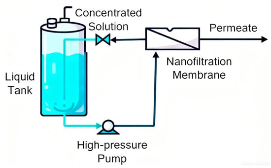 The experimental system is schematically presented in Figure 1. The feed solution was initially introduced into the storage tank, from where it was transferred to the nanofiltration membrane module by means of a high-pressure pump. The feed flow rate was adjusted through precise regulation of the pump frequency, while the operating pressure of the nanofiltration unit (2–3 MPa) was controlled by systematic valve adjustment.