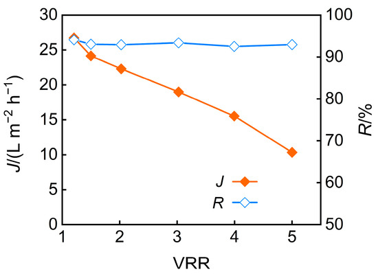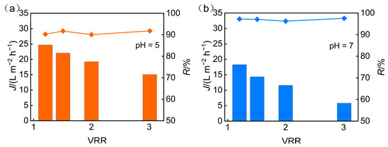 The influence of the concentration factor on nanofiltration membrane performance was deeply studied. The effect of the concentration factor on permeate flux and TP rejection under conditions of pH 5 and an operating pressure of 3 MPa is illustrated in Figure 8. As the concentration factor increases, osmotic pressure rises, and membrane fouling intensifies, leading to a sustained reduction in permeate flux. The TP rejection rate remained almost unchanged, which can be attributed to two opposing factors. On one hand, the reduction in permeate flux weakened the convective effect of water, potentially leading to a decrease in TP rejection. On the other hand, the increase in fouling caused the membrane pores to narrow, thereby enhancing TP rejection.
