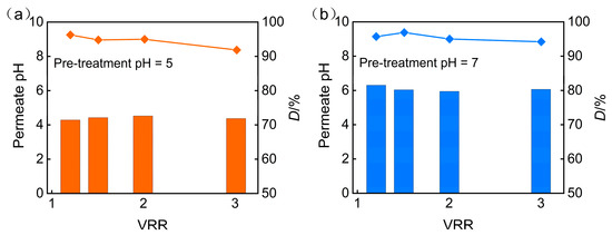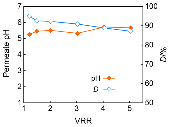Additionally, the increase in the pH of the feed solution will also impact the desalination rate of the nanofiltration permeate. Figure 4 illustrates the effect of pretreatment pH on the pH and desalination rate of nanofiltration permeate under an operating pressure of 3 MPa. It can be observed that the increase in the pH of the feed solution leads to an increase in the desalination rate. The increase in the pH of the feed solution enhances the surface charge density of the nanofiltration membrane and strengthens the electrostatic repulsion between the nanofiltration membrane and inorganic salt ions. Therefore, the desalination rate is higher at pH = 7. During the concentration process, the salt content in the feed solution increases, which enhances the shielding effect of inorganic salts on the surface charge of the nanofiltration membrane and weakens the electrostatic repulsion effect. Consequently, the desalination rate of the nanofiltration membrane slowly decreases with the increase in concentration ratio. On the other hand, an increase in the salt content of the feed solution causes swelling of the membrane pores, which may also reduce the desalination rate. Therefore, by adjusting the pH of the feed solution through pretreatment, the desalination rate increases, but as the concentration ratio increases, the desalination rate decreases.