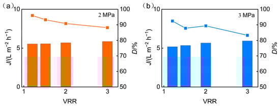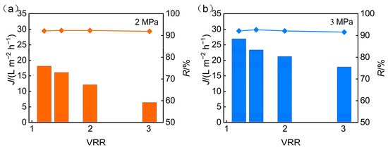 Optimization of operating pressure is crucial for balancing high recovery, high concentration ratio, and low energy consumption. To refine process parameters and elucidate the regulatory role of pressure in membrane concentration, the influence of operating pressure on the performance of nanofiltration membranes was further explored. Figure 5 illustrates the impact of operating pressure on membrane permeate flux and TP rejection under conditions where the pH was maintained at 5 and the concentration ratios ranged from 1 to 3.