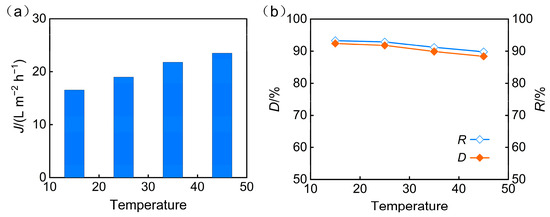 To investigate the effect of temperature on the nanofiltration performance for treating phosphorus-containing wastewater, experiments were conducted under fixed conditions of pH = 5, an operating pressure of 3 MPa, and a VRR of 3, across a temperature range of 15, 25, 35, and 45 °C. The results indicated that temperature increase had a dual effect on membrane separation performance. On one hand, the rise in water temperature reduced water viscosity, leading to a significant enhancement in membrane flux (Figure 7a). On the other hand, elevated temperature increased the mobility of polymer membrane segments and the diffusion capacity of solutes, potentially causing membrane pore swelling and weakening the sieving and electrostatic repulsion effects. For phosphate ions (primarily present as H2PO4− at pH = 5) and other inorganic salt ions in this system, this weakening effect manifested as a gradual decreasing trend in TP rejection and desalination rates with increasing temperature (Figure 7b).