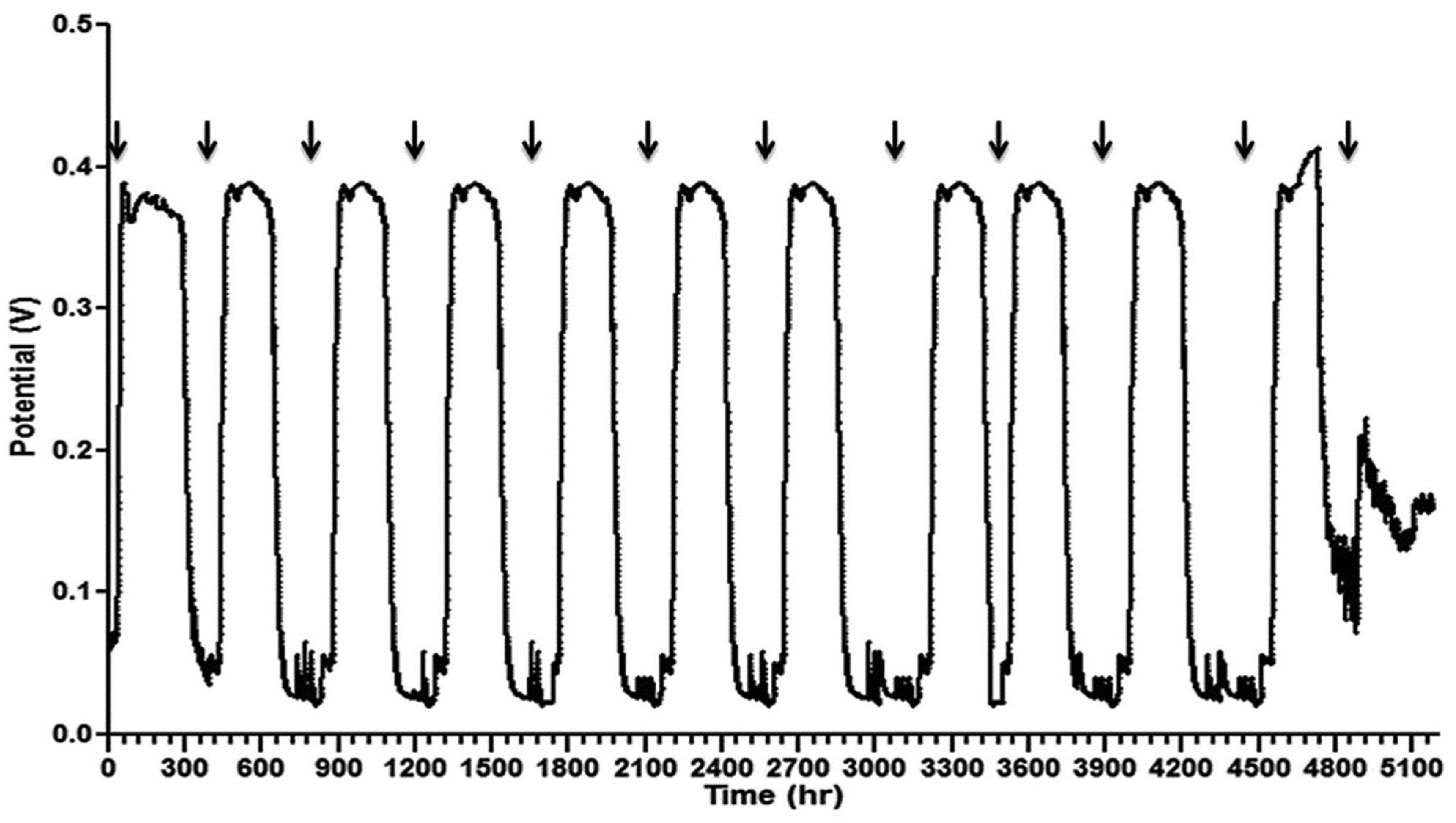 | Nafion 117 | 400 | 0.95–1.01 | - | 6 months at 30 °C, pH 7; 37% power loss due to fouling |