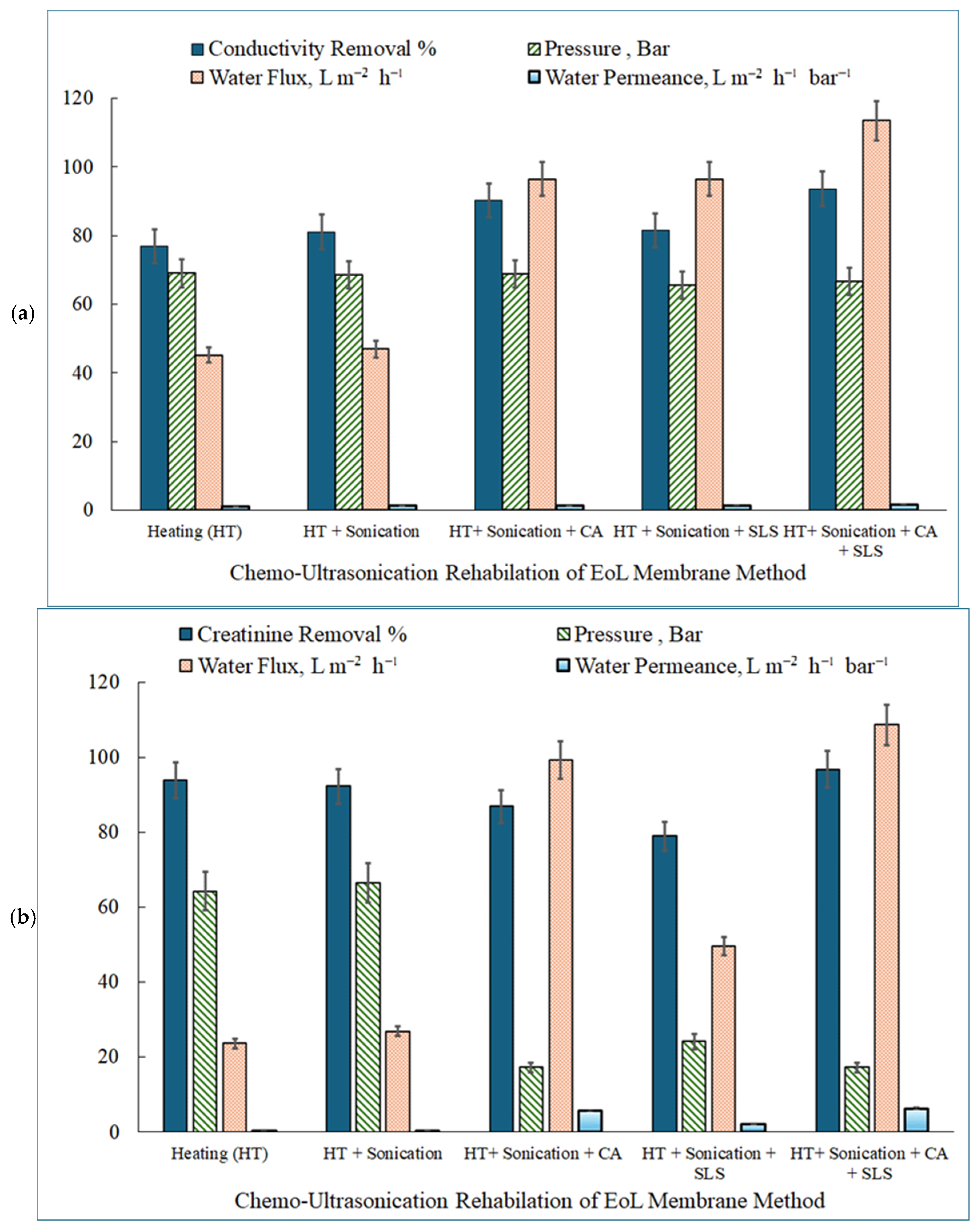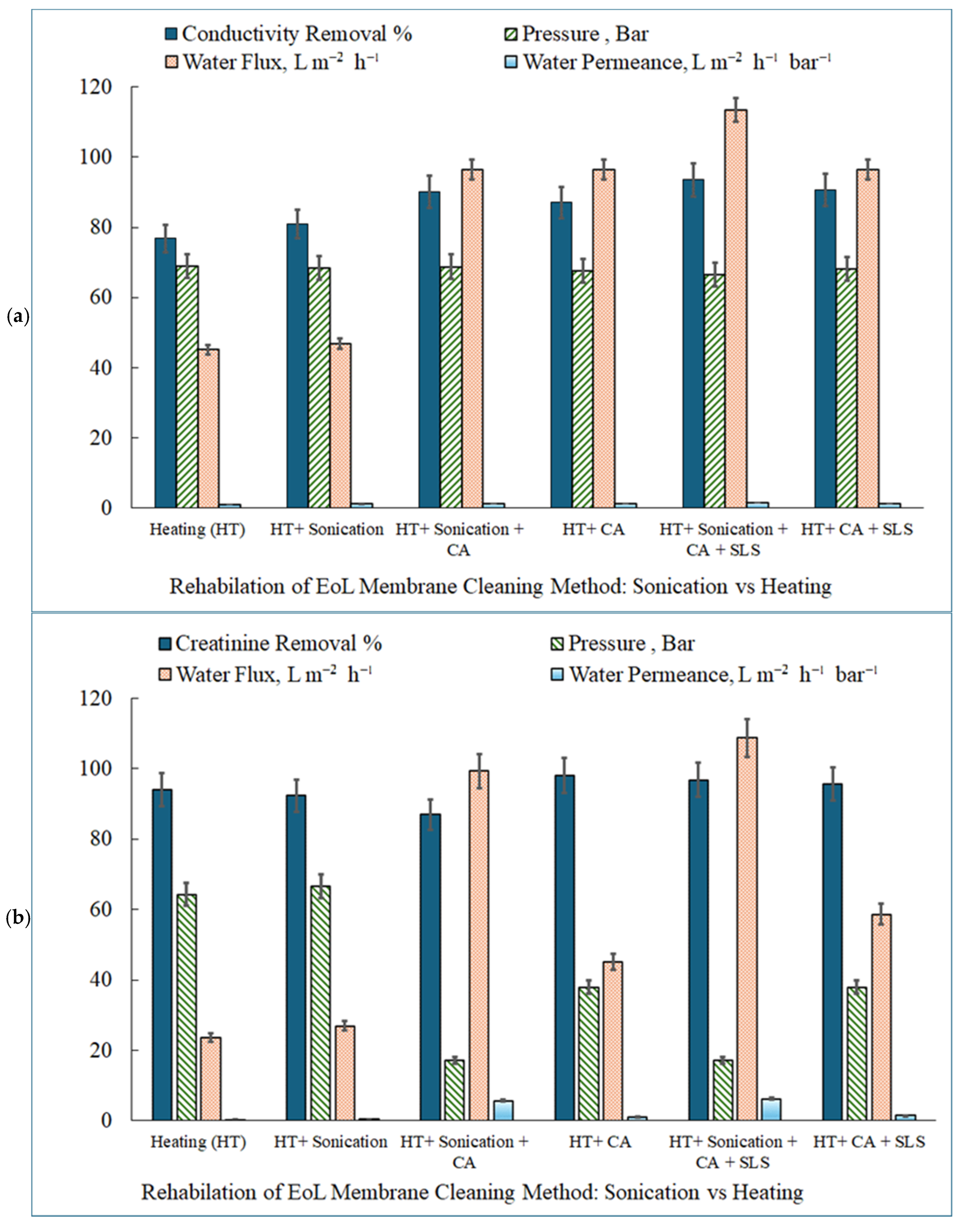 | 12 | TFC dialysate RO membrane | Mixed organic + inorganic + proteinaceous | CA + SLS + Heat + Ultrasonication 45 kHz, 30 min, 45 °C, 120 W | 1:1 Citric acid + SLS (0.1 M each) | Conductivity 93.56%, Creatinine 96.83% | Flux: 113.48 / 108.75 L m−2 h−1, Permeance: 1.70 / 6.31 L m−2 h−1 bar−1 | Present study |