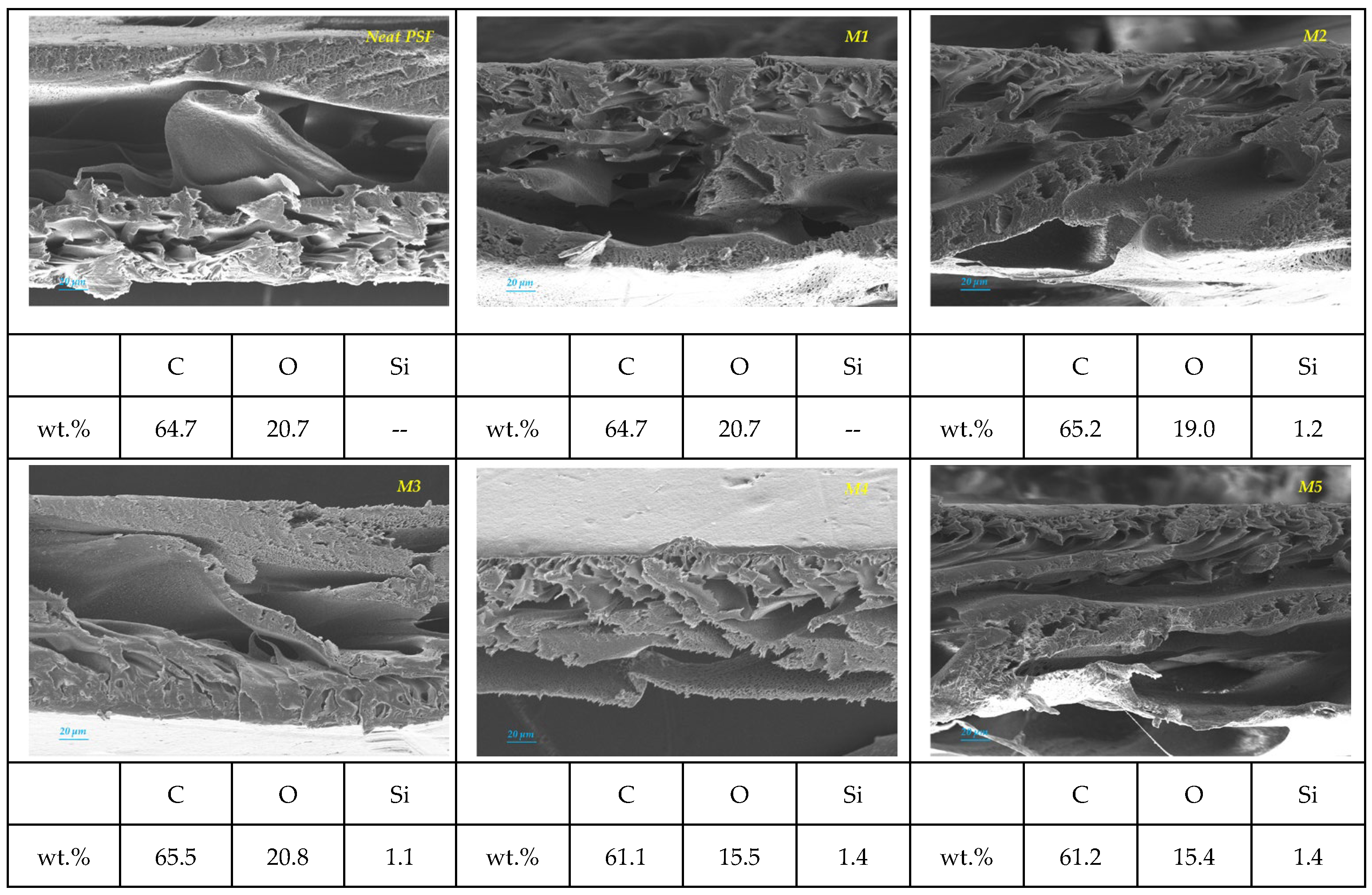 Figure 9. Elemental microanalyses and EDS pattern of the different samples: Neat PSF, M1 (MMT-0.5%wt), M2 (MMT-1%wt), M3 (MMT-1.5%wt), M4 (MMT-2%wt), and M5 (MMT-2.5%wt). Elements analyzed: carbon (C), silicon (Si), and oxygen (O).