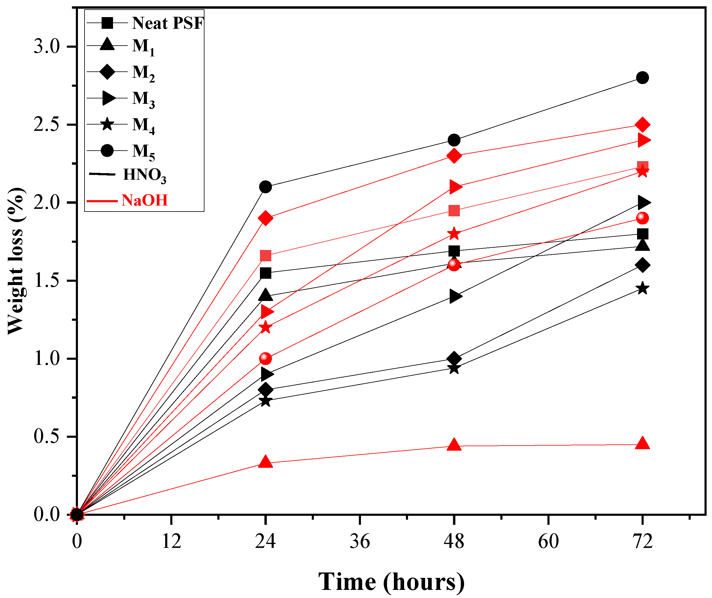 Figure 10. Weight loss percentage versus time of the prepared membranes after immersion in HNO3 and NaOH for 3 days at room temperature.