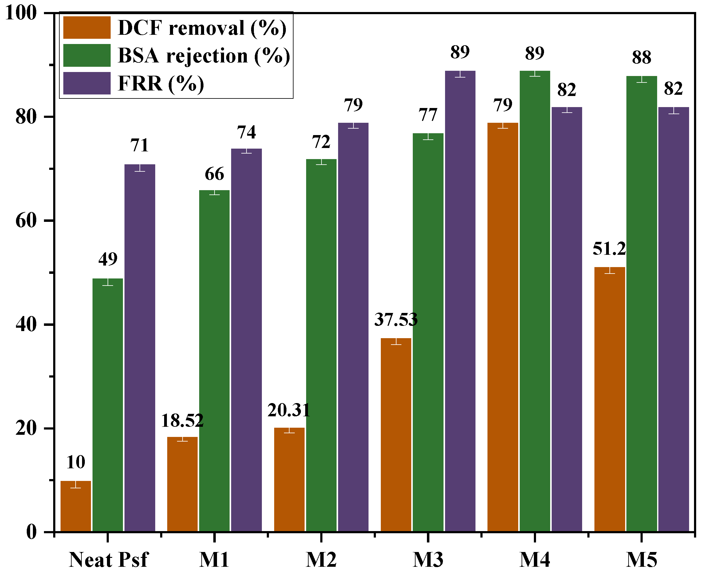 The influence of montmorillonite (MMT) incorporation into polysulfone (PSF) membranes on diclofenac (DCF) and bovine serum albumin (BSA) removal efficiencies, as well as on the flux recovery ratio (FRR), is illustrated in Figure 12.