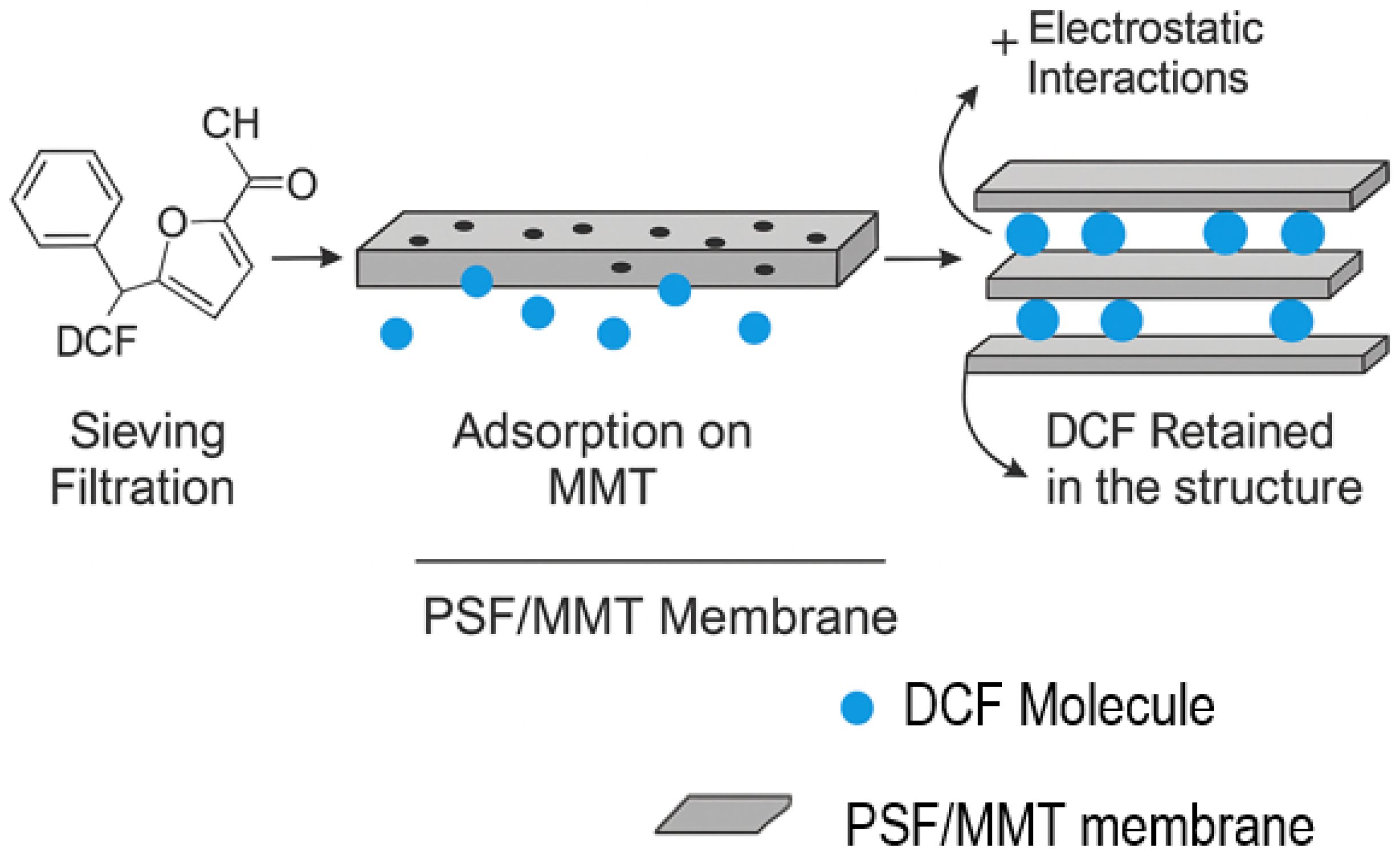 Figure 13. Schematic representation of the diclofenac (DCF) removal mechanism by PSF/MMT composite membranes.