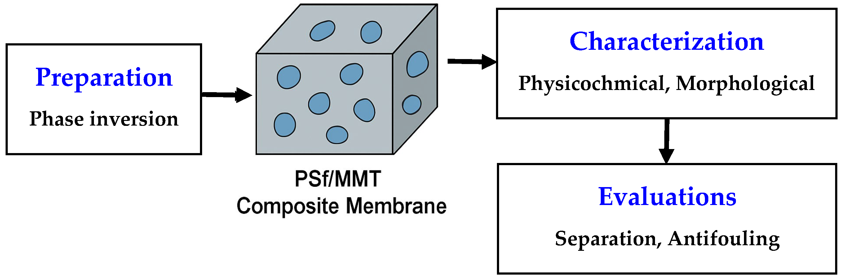 Scheme 1 presents the conceptual framework of this work. It highlights the sequential approach adopted in this study: (i) fabrication of the PSF/MMT composite membranes through the phase inversion method, (ii) characterization of their physicochemical and morphological properties, and (iii) evaluation of their separation and antifouling performance. This workflow provides a clear overview of the experimental logic linking membrane structure to performance.