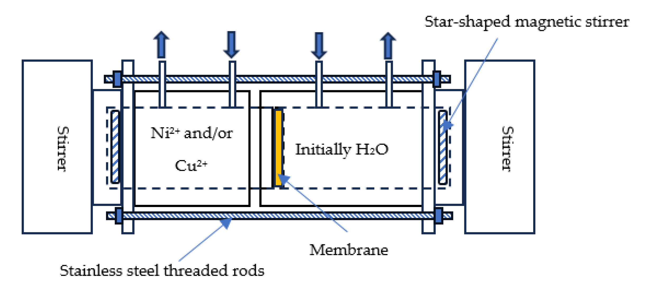 - Ncib, S.; Chibani, A.; Barhoumi, A.; Larchet, C.; Dammak, L.; Elaloui, E.; Bouguerra, W. Separation of Copper and Nickel from Synthetic Wastewater by Polymer Inclusion Membrane Containing Di(2-Ethylhexyl)Phosphoric Acid. Polym. Bull. 2023, 80, 12177–12192. [Google Scholar] [CrossRef]