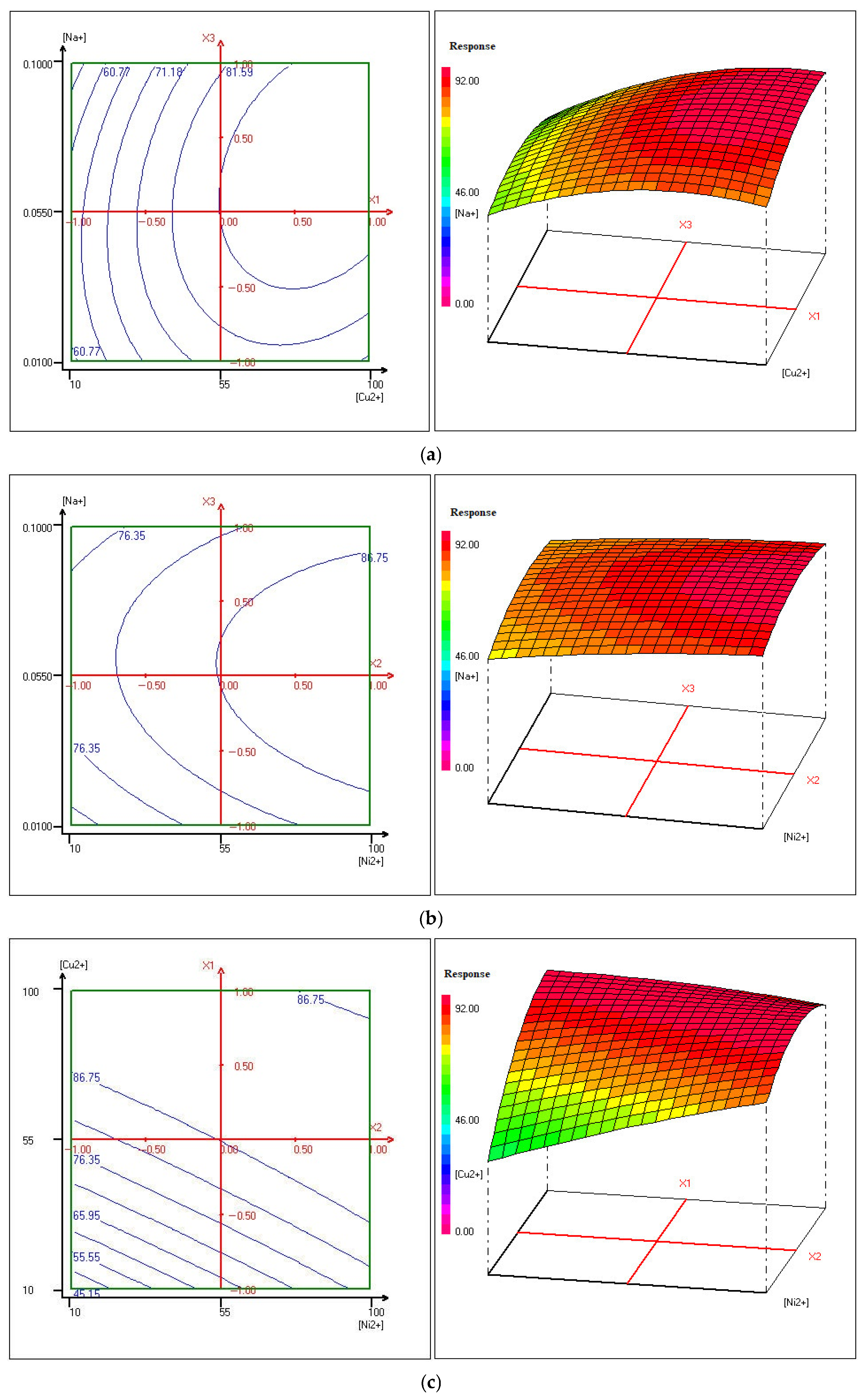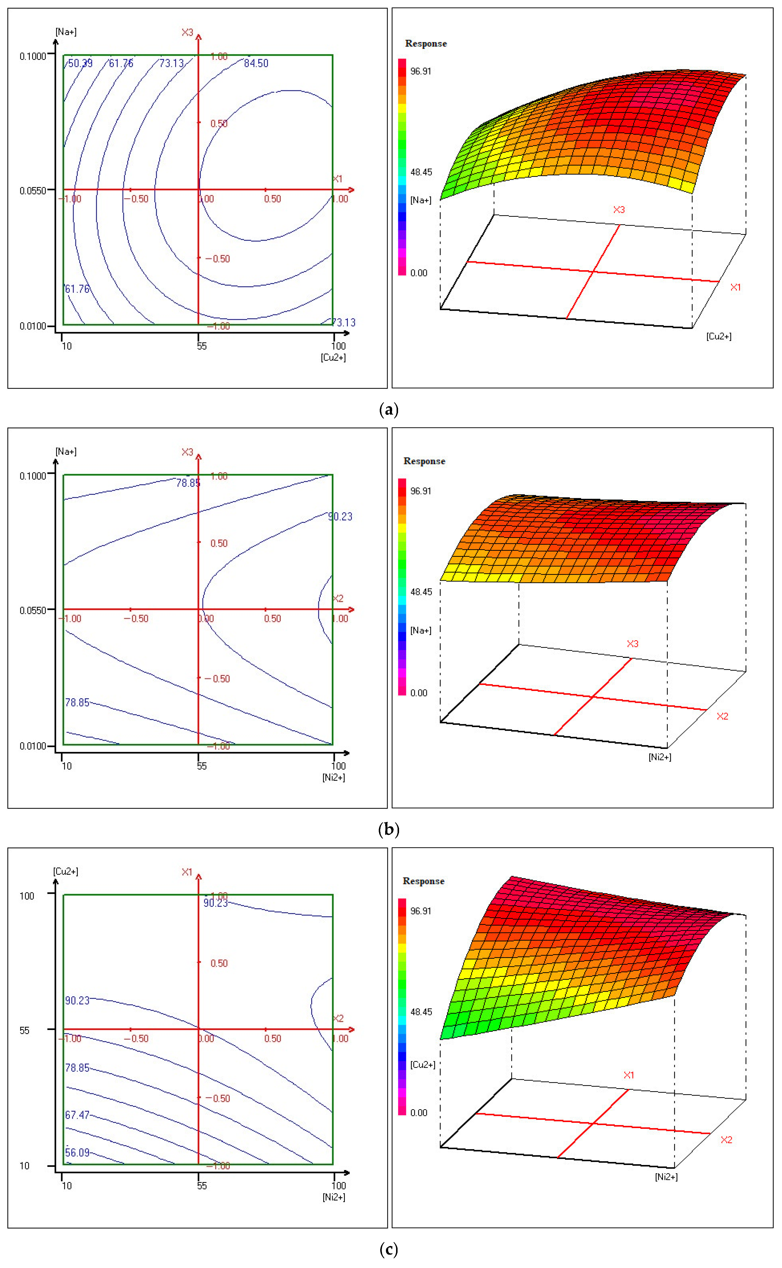 | No. Exp | X1 | X2 | X3 | [Cu2+] | [Ni2+] | [Na+] | Y1exp(%) | Y1Cal(%) | Y2exp(%) | Y2Cal(%) |