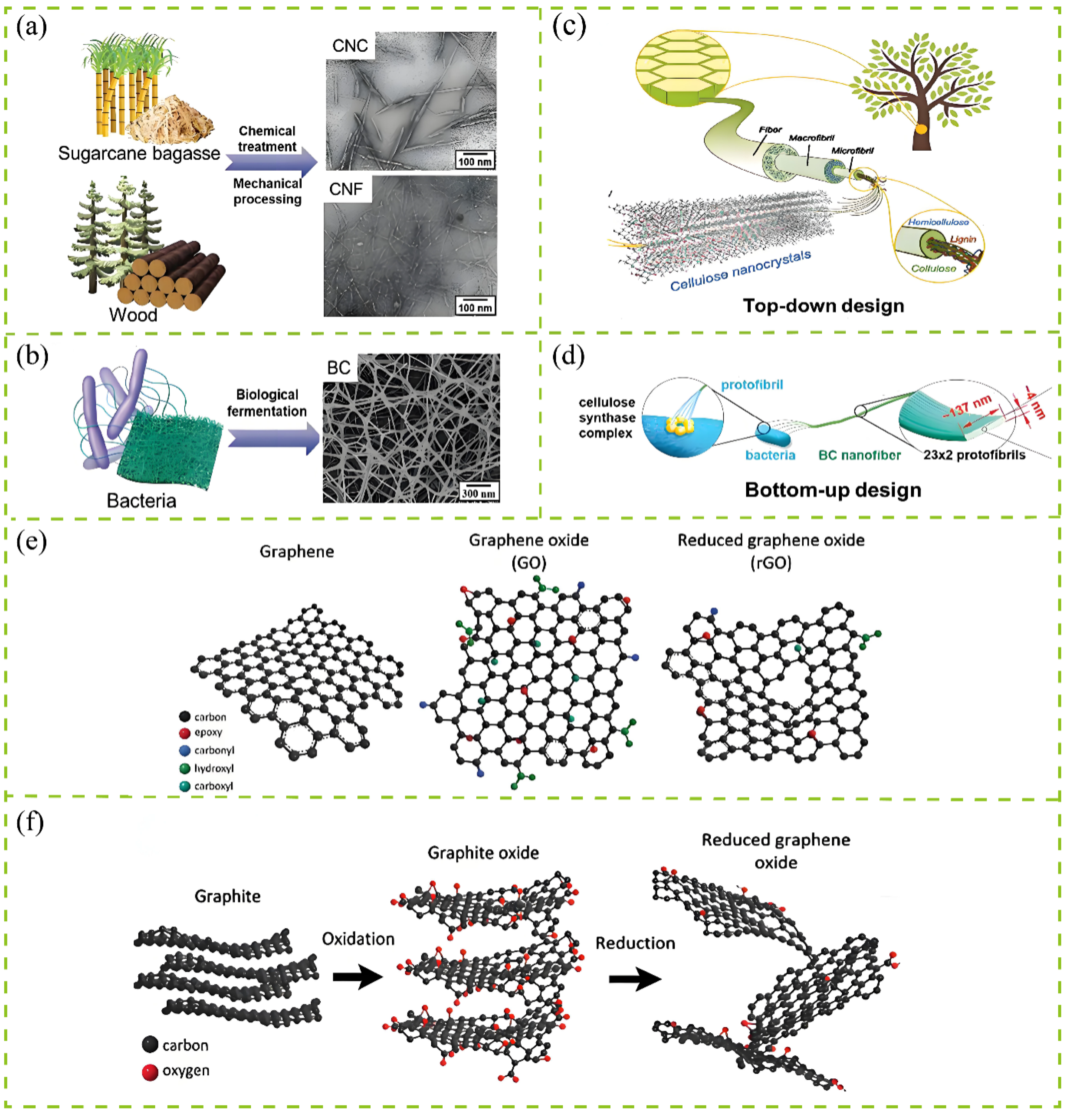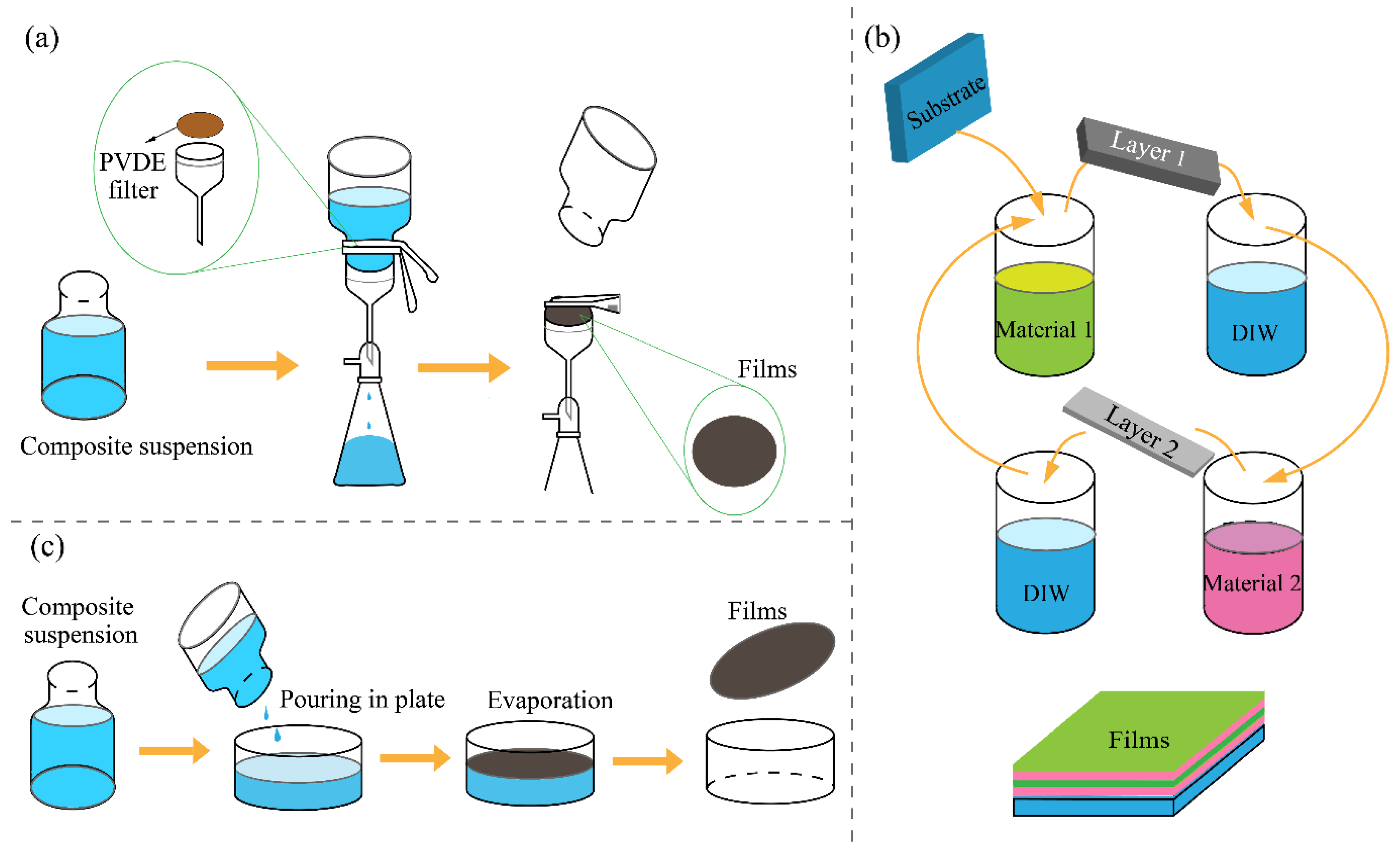 | Solution casting [54] | CNF/BC and rGO/aminated GO (Well-functionalized) | 1. Intuitive and straightforward process 2. Facilitates formation of structurally uniform films | 1. Poor control over film thickness and pore structure 2. Challenges exist for large-scale production |