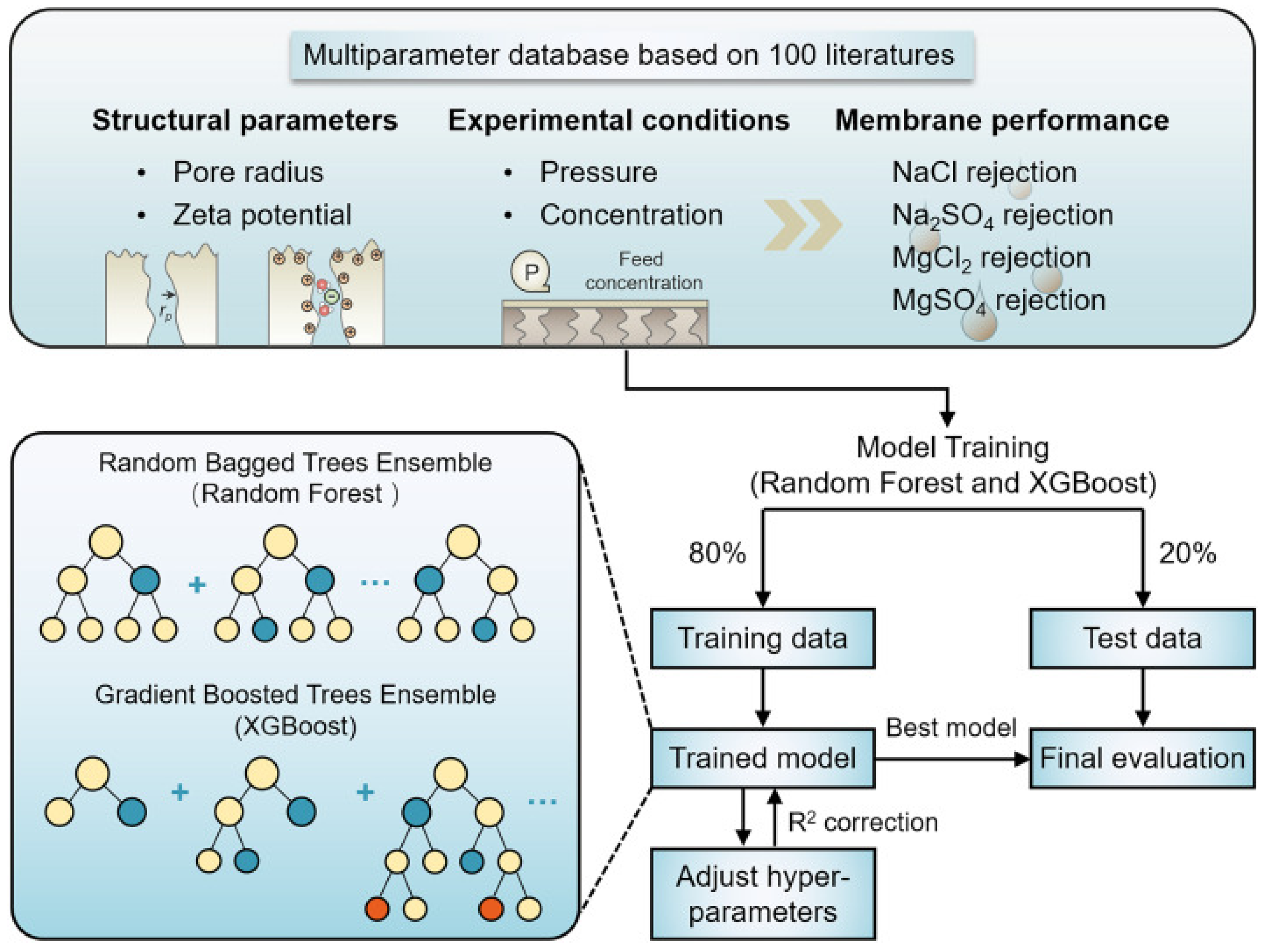 | XGBoost | Supervised (Regression) | Prediction of organic contaminant rejection rate in nanofiltration (NF) and reverse osmosis (RO) membranes | MWCO, molecular weight (MW), McGowan volume (V), contact angle (CA), total charge (TC), pressure (P), initial concentration (Cin), pH, hydrogen bond basicity (B), and time (T) | Rejection rate (%) | R2_adj = 99.5%, R2_ext = 87.3%, RMSE = 1.674, MAE = 1.065 | [78] |