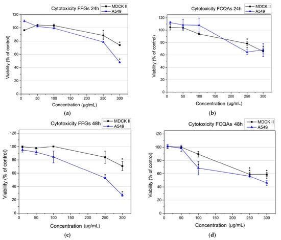 Cytotoxicity of FFGs (a,c) and FCQAs (b,d) on MDCK II and A549 cell lines after 24 h (a,b) and 48 h (c,d). The data were analyzed with OriginPro 9.0 and presented as a mean value ± SE. Statistical significance (*) is according to one-way ANOVA at the 0.05 level.
