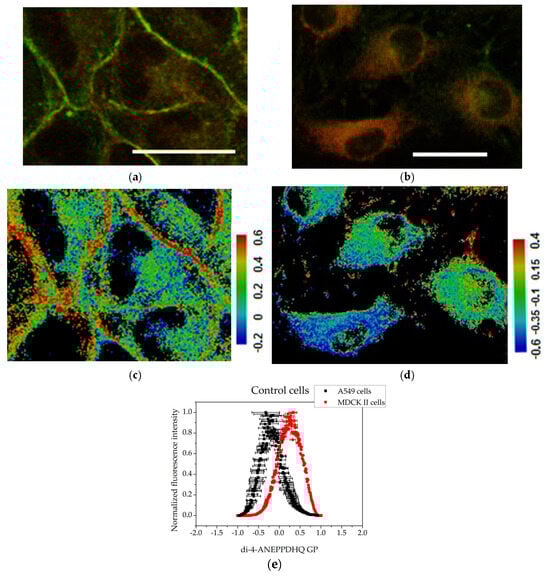 Assessment of the degree of cell membrane order using the fluorescent probe Di-4-ANEPPDHQ excited at 488 nm: (a) MDCK II cells merged image of emission at 560 nm (green) and 620 nm (red); (b) A549 cells merged image of emission at 560 nm (green) and 620 nm (red). Scale bar—25 µm. GP images of control cells: (c) MDCK II cells GP image; (d) A549 cells GP image. Scale bar—blue range corresponds to a more fluid lipid state and the red range to the ordered phase, respectively. Summarized data for the generalized polarization of membranes. (e) Histograms obtained with the CellTool and Origin programs from GP images of control cells. Mean values of all measurements and standard errors (bars).