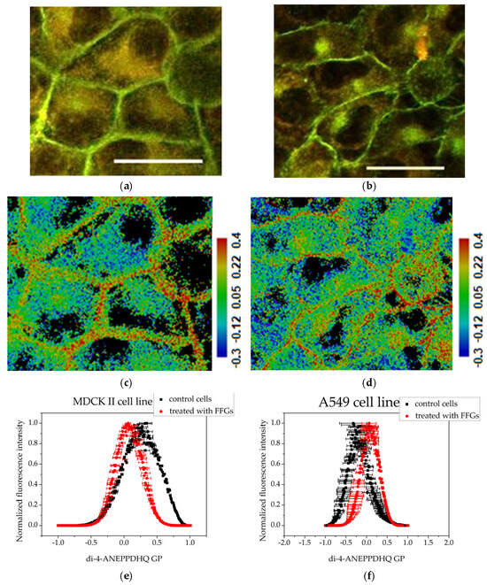 Assessment of the degree of membrane ordering after treatment with 200 μg·mL−1 fraction enriched in FFGs using the fluorescent probe Di-4-ANEPPDHQ excited at 488 nm: (a) MDCK II cells merged image of emission at 560 nm (green) and 620 nm (red); (b) A549 cells—merged image of emission at 560 nm (green) and 620 nm (red). Scale bar—25 µm. (c) MDCK II GP image; (d) A549 cells GP image. Scale bar—blue range corresponds to more fluid lipid state and the red range to the ordered phase, respectively. Summarized data for the generalized polarization of membranes—(e,f): histograms obtained with the CellTool and Origin programs from GP images of treated cells. Mean values of all measurements and standard errors (bars).