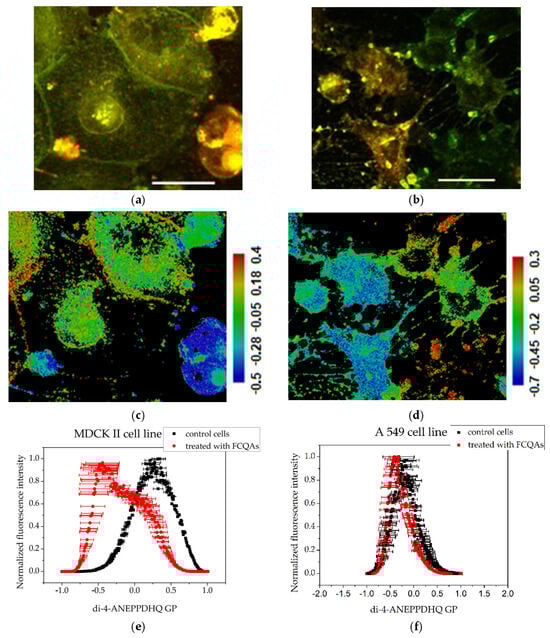 Assessment of the degree of membrane ordering after treatment with 200 μg·mL−1 fraction enriched in FCQAs using the fluorescent probe Di-4-ANEPPDHQ excited at 488 nm: (a) MDCK II cells merged image of emission at 560 nm (green) and 620 nm (red); (b) A549 cells—merged images of emission at 560 nm (green) and 620 nm (red). Scale bar—25 µm. (c) MDCK II GP images; (d) A549 cells GP images. Scale bar—blue range corresponds to more fluid lipid state and the red range to the ordered phase, respectively. Summarized data for the generalized polarization of membranes—(e,f): histograms obtained with the CellTool and Origin programs from GP images of treated cells. Mean values of all measurements and standard errors (bars).