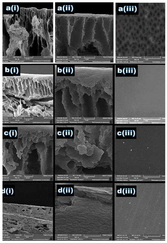 The SEM images of ACF membranes at different weight concentrations: (a) 15 wt.%, (b) 17.5 wt.%, (c) 20 wt.%, and (d) 22.5 wt.% for (i) cross-section at 20 µm magnification, (ii) cross-section at 5 µm magnification, and (iii) surface layer with 5 µm magnification.