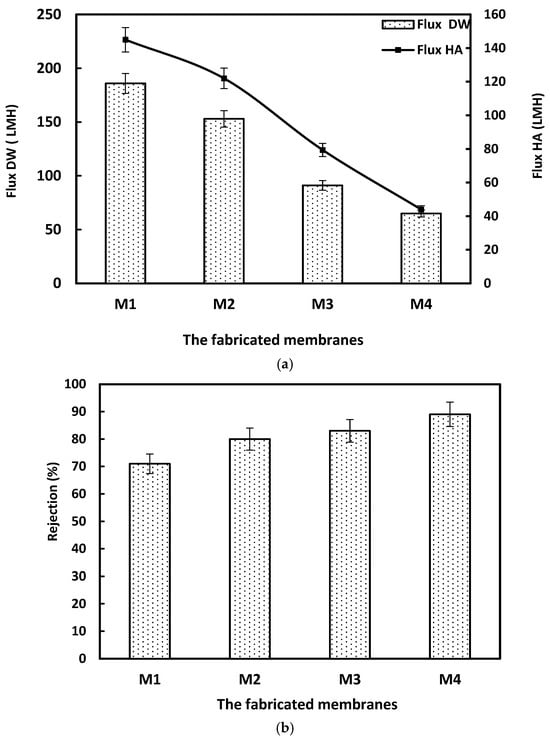 Figure 4a illustrates the permeation flux of the fabricated membranes containing different weights of ACF polymer waste. The flux for distilled water and humic acid solution (50 ppm) was measured using a filtration system for 60 min and 90 min for DW and HA, respectively. The permeated water was collected every 15 min to calculate the flux in LMH. The permeation fluxes of the membranes when performed for pure water and HA were decreased as the weight percent of ACF was increased. The pure water flux of the M1 membrane decreased from 186 to 65 LMH in M4. The same reduction was obtained in permeate flux during filtering the HA solution, reaching 145 and 44 LMH for M1 and M4 membranes, respectively. This reduction trend was accompanied by an improvement in the rejection percent of the HA solution. The rejection increased from 71 to 89% as the weight of polymer was raised from 15 to 22.5 wt.%, as shown in Figure 4b [].