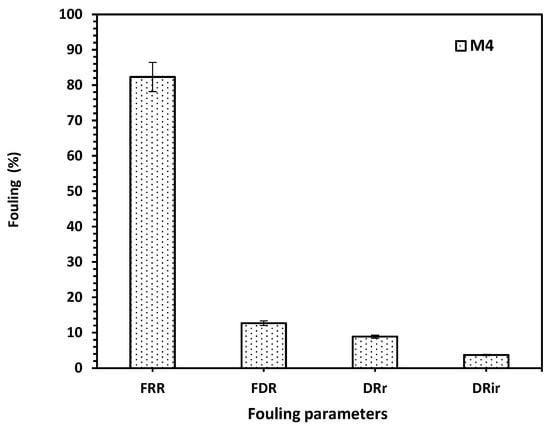The fouling performance analysis of the M4 membrane, expressed as percentages for FRR, FDR, DRr, and DRir.