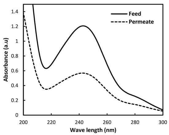 To ensure the efficiency of the prepared M4, the membrane was tested using paracetamol. The strong peak around 245 nm is typical for the benzene ring conjugated with a hydroxyl and amide group. As shown in Figure 8, the absorbance intensity of the permeate is significantly lower than that of the feed. This indicates that the M4 membrane has good efficiency towards paracetamol. The spectral shape shows that the removal of paracetamol occurs by physical rejection or adsorption, with no degradation during filtration. This result supports the potential of waste-based membranes for micropollutant removal from wastewater, particularly pharmaceutical residues, where the removal percentage of paracetamol reached 54%.
