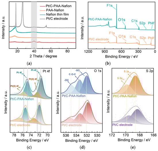 XRD pattern (a) and XPS spectra (b–e) of the Pt/C–PAA–Nafion electrode: XPS spectra of Pt 4f orbital (c), O 1s orbital (d), and S 2p orbital (e). The dashed lines (Figure 3c) represent the bonding energy sites of four electron states of Pt 4f spectra in the Pt/C–PAA–Nafion electrode. The dashed lines (Figure 3d) exhibit the bonding energy sites of –OH, C–O–C, and –SO3 groups in the Pt/C–PAA–Nafion electrode. The grey area is related to the (111) planes of Pt (PDF#04-0802). The dashed lines (Figure 3e) are the site of the bonding energy of the two electron states for the S 2p spectra in the Pt/C-PAA–Nafion electrode.