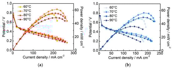 Furthermore, the methanol-transport behaviors within the Pt/C–PAA–Nafion electrode are explored to elucidate its impact on the MOR activity. Contact-angle measurement is first conducted on both the Pt/C–PAA–Nafion electrode and the conventional Pt/C electrode. As shown in Figure 9a, the contact angles for both electrodes decrease over time, indicating that methanol transport occurs within both electrodes. However, the initial contact angles are comparable, suggesting a similar methanol distribution at the electrode–membrane interface. From 10 to 60 min, the Pt/C–PAA–Nafion electrode maintained a larger contact angle. This observation suggests that methanol transport is more impeded in the Pt/C–PAA–Nafion electrode. Therefore, the authors could conclude that the Pt/C–PAA–Nafion electrode partially restricts the transport of methanol solution from the cathode–membrane interface into the cathode catalyst layer. To further analyze the methanol-transport process, the mass of the methanol solution within each electrode is quantified. Figure 9b shows the mass of the Pt/C–PAA–Nafion electrode before and after the transport processes of the methanol solution, with 38% more methanol solution than that of the conventional Pt/C electrode. This result indicates a greater methanol solution uptake within the Pt/C–PAA–Nafion electrode. This suggests that the unique pore structure of the Pt/C–PAA–Nafion electrode facilitates the enhanced methanol solution transport and retention. Finally, the MOR activity of both electrodes is evaluated via CV and LSV to correlate the observed methanol-transport properties with corresponding electrochemical properties. Based on Figure 5c, the average RMOR from three measurements of DMFC assembled with the Pt/C–PAA–Nafion electrode is 0.99 Ω cm2, with a slight increase of 6.30%~19.3%, compared to that of DMFC assembled with the conventional Pt/C electrode. Many researchers have found that MOR not only occurs in the anode fed with methanol solution but also happens in the cathode due to methanol crossover. Hence, the discrepancy in RMOR should be related to the methanol–oxygen reactions in the cathode and anode of DMFCs. For the anode of these DMFCs, CV characterization is conducted to explore the electrochemical properties, as shown in Figure 10. Apparently, all CV curves for the anode of DMFCs with different cathodes display the same redox peaks and comparable peak current density at 60 °C, 70 °C, 80 °C, and 90 °C, respectively. Further, the same PtRu loadings and methanol concentration are found within the anode of two DMFCs. Hence, we could regard that DMFCs with different Pt/C electrodes exhibit comparable methanol–oxygen reactions in the anode, and then the discrepancy in RMOR is consistent with the methanol–oxygen reactions in the cathode of DMFCs.