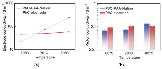 Furthermore, EIS measurements are performed on both the Pt/C–PAA–Nafion electrode and the conventional Pt/C electrode to evaluate the impact of conductivity on the performance of DMFCs. Although a layer-resolved conductivity analysis using blocked-electrode EIS is more suitable, the effective electrode conductivity and effective proton conductivity are obtained according to the method described in our previous work, which could also be used to analyze the influence of conductivity on the performance of DMFCs []. As illustrated in Figure 7a, the average conductivity from three measurements of all electrodes increases with rising temperature. At 60 °C, the Pt/C–PAA–Nafion electrode exhibits a smaller conductivity than the conventional Pt/C electrode. However, at higher temperatures of 70 °C and 80 °C, the Pt/C–PAA–Nafion electrode demonstrates superior conductivity. This suggests more efficient charge transfer within the Pt/C–PAA–Nafion electrode, resulting in lower ohmic resistance in the corresponding DMFC compared to that using the conventional Pt/C electrode. Moreover, the average proton conductivity from three measurements of the Pt/C–PAA–Nafion electrode follows a similar trend with increasing temperature and reaches comparable values to that of the conventional Pt/C electrode, with the highest proton conductivity observed at 80 °C. These findings indicate that the differences in overall conductivity between the two electrodes are primarily due to variations in electron-transfer behavior, thereby influencing the ohmic resistance of DMFCs. Hence, the enhanced electronic conductivity facilitated by the entangled porous-nanofiber networks is identified as the key factor accounting for the reduced ohmic resistance in DMFCs assembled with the Pt/C–PAA–Nafion electrode.